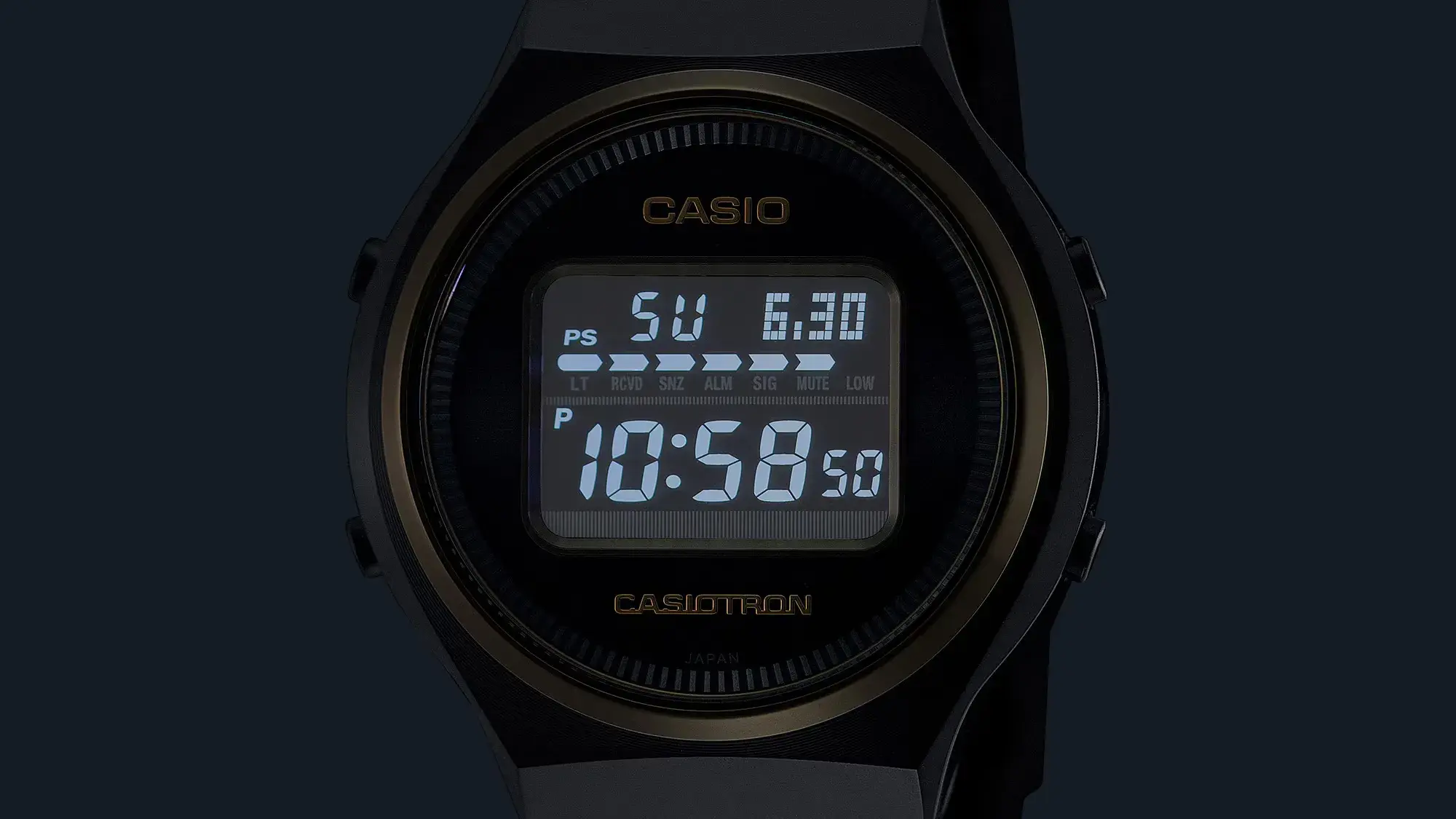 Мужские кварцевые электронные наручные часы на солнечной батарее. Коллекции Casiotron. Специальная серия, посвященная 50-летию компании Casio. Дизайн корпуса часов напоминает первые часы, выпущенные фирмой Casio в 1974 г - Casiotron QW02. Это были первые в истории электронные часы с функцией календаря, который автоматически подстраивал количество дней в каждом месяце. На стеклянной задней крышке часов гравировка в форме треугольного небоскреба штаб-квартиры Casio и юбилейного логотипа 50-th Anniversary. Такая же надпись (50-th Anniversary) выгравирована на золотистом звене браслета часов. Часы оснащены беспроводной технологией Bluetooth® со сверхнизким потреблением энергии для синхронизации со смартфоном. При подключении к смартфону часы автоматически корректируют текущее время и получают доступ к ряду полезных функций. Питание от солнечной энергии (технология Tough Solar) - источником питания служит светочувствительная панель и аккумулятор, подзаряжаемый при попадании солнечного света на дисплей часов. Функция энергосбережения (в темноте дисплей гаснет). Индикатор уровня заряда батареи. Срок работы часов с полным зарядом около 11 месяцев, и около 22 месяцаев при включенной функциии энергосбережения. Технология Multiband 6 - коррекция текущего времени радиосигналом почти по всему миру: Англия, Германия, США, Япония и Китай. Светодиодная подсветка с функцией послесвечения. Выбираемая длительность подсветки 2 или 4 секунды. Секундомер с точностью показаний 1/100 секунды и временем измерения 24 ч. Режимы измерения: прошедшее время, промежуточное время, два финишных результата. Таймер обратного отсчета от 1 секунды до до 24 часов с автоматическим повтором. 12/24х часовой формат отображения времени. 5 ежедневных будильников, один с функцией повтора сигнала, ежечасный сигнал. Мировое время - 39 часовых поясов (39 городов), всемирное координированное время (UTC), автоматическое переключение на летнее время (DST). Включение/выключение звука кнопок. Автоматический календарь до 2099 года, возможность отображения дня недели на шести языках. Функция поиска телефона. Круглый стальной корпус с покрытием чёрного цвета. Размеры корпуса 42,7 мм на 39,1 мм, толщина 12,3 мм. Стальной безель с покрытием цвета розового золота. Устойчивое к мелким механическим повреждениям минеральное стекло. Стальной браслет с покрытием чёрного цвета, тройная раскладывающаяся застежка. Завинчивающаяся задняя крышка из закалённого стекла. Водонепроницаемость 50 WR (мытьё рук, дождь). Вес около 111 г. Сборка модели осуществляется в Японии на премиальном производстве Casio в Ямагата. Часы поставляются в специальной экоупаковке, изготовленной из переработанных материалов.