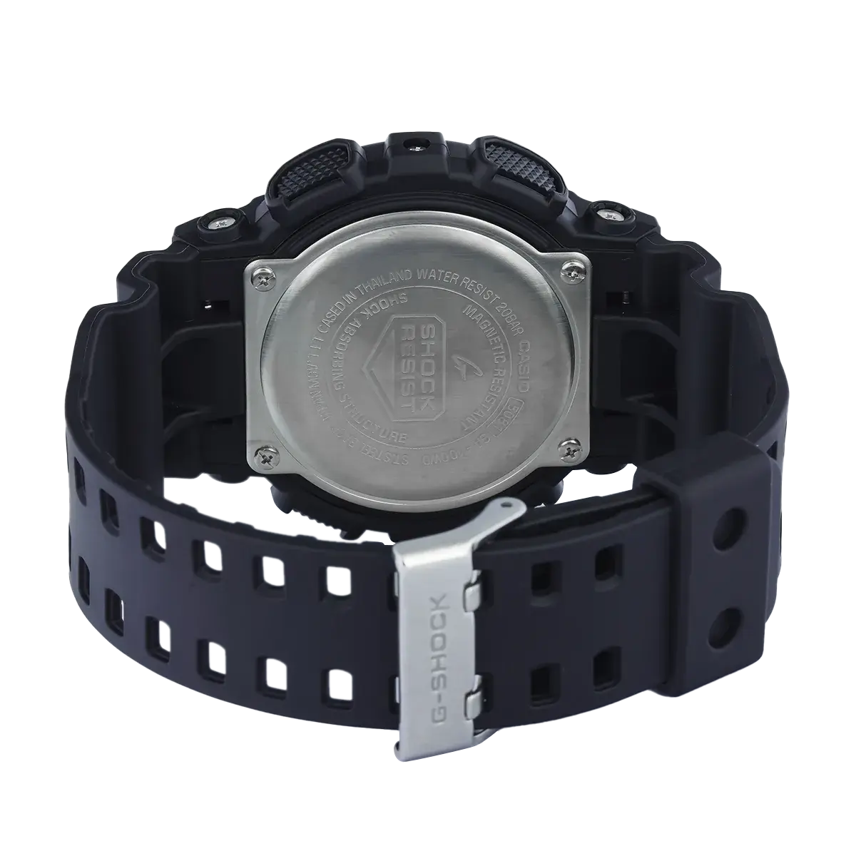 Мужские кварцевые наручные часы c аналого-цифровым отображением времени. Серия Casio G-Shock. Новинка в крупном матовом черном корпусе со стильным аналого-цифровым циферблатом золотистого цвета. Противоударный корпус защищает механизм часов от ударов и вибрации. Часы созданы с защитой от воздействия магнитных полей. Автоматическая светодиодная подсветка — при недостаточном освещении поворот руки включает подсветку циферблата, выбор продолжительности подсветки 1,5 или 3 секунды, послесвечение. Светящееся покрытие стрелок обеспечивает длительное послесвечение в темноте после короткого воздействия света. Мировое время – 48 городов (29 часовых поясов), всемирное координированное время (UTC). Автоматический переход на зимнее и летнее время, возможность включения/отключения данной функции. 12-ти и 24-х часовой формат отображения времени. Секундомер с точностью показаний 1/1000 с и временем измерения 100 ч. Режимы измерения: пройденное время, время круга, промежуточное время. Расчет скорости по выбранной дистанции. Таймер обратного отсчета от 1 мин до 24 ч (с шагом в 1 минуту и с шагом в 1 час) с автоповтором. 5 ежедневных будильников, один с функцией повтора сигнала Snooze, ежечасный сигнал. Автоматический календарь до 2099 года. Круглый корпус из полимерного пластика чёрного цвета. Размер корпуса 51,2 мм на 55мм, толщина 16,9мм. Устойчивое к мелким механическим повреждениям минеральное стекло. Чёрный пластиковый ремешок с классической застежкой Buckle. Батарея рассчитана на 2 года. Водонепроницаемость 200WR (плавание и ныряние без акваланга). Вес около 72 г.