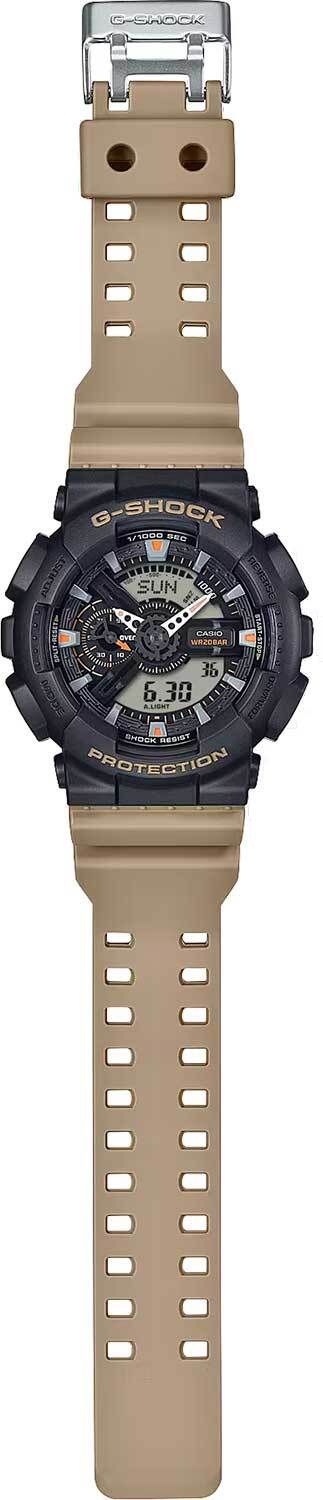 Мужские кварцевые наручные часы c аналого-цифровым отображением времени. Серия Casio G-Shock. Противоударный корпус защищает механизм часов от ударов и вибрации. Часы созданы с защитой от воздействия магнитных полей. Автоматическая светодиодная подсветка — при недостаточном освещении поворот руки включает подсветку циферблата, выбор продолжительности подсветки 1,5 или 3 секунды, послесвечение. Мировое время – 48 городов (29 часовых поясов), всемирное координированное время (UTC). Функция включения/отключения летнего времени. Переключение между домашним и мировым временем. 12-ти и 24-х часовой формат отображения времени. Секундомер с точностью показаний 1/1000 с и временем измерения 100 ч. Режимы измерения: пройденное время, время круга, промежуточное время. Расчет скорости по выбранной дистанции. Таймер обратного отсчета от 1 мин до 24 ч (с шагом в 1 минуту и с шагом в 1 час) с автоповтором. 5 ежедневных будильников, один с функцией повтора сигнала (Snooze), ежечасный сигнал. Автоматический календарь до 2099 года. Круглый корпус из полимерного пластика чёрного цвета. Размер корпуса 51,2 мм на 55мм, толщина 16,9мм. Устойчивое к мелким механическим повреждениям минеральное стекло. Пластиковый ремешок бежевого цвета с классической застежкой Buckle. Приблизительный срок службы батареи 2 года. Водонепроницаемость 200 WR (плавание и ныряние без акваланга). Вес около 72 г.