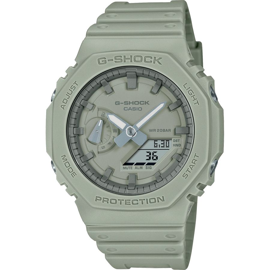 Мужские аналого-цифровые кварцевые наручные часы. Серия Casio G-Shock. Противоударный пластиковый корпус с углеродными волокнами (структура Carbon Core Guard) защищает внутренний модуль часов от повреждений и деформаций при ударах. Двойная светодиодная подcветка, настройка продолжительности подсветки 1,5 или 3 секунды, послесвечение. 12-ти и 24-х часовой формат отображения времени. Секундомер с точностью 1/100с (первый час) и 1 секунда (после первого часа) и временем измерения 24ч. Таймер обратного отсчета от 1с до 24ч (с интервалом в 1 секунду). Мировое время – 48 городов (31 часовой пояс), всемирное координированное время (UTC). Функция включения/отключения летнего времени. Ретроградный стрелочный указатель дня недели. Автоматический календарь до 2099 г. Функции отключения/включения звука кнопок и перемещения стрелок. 5 ежедневных будильников; сигнал начала часа. Минеральное стекло устойчивое к мелким механическим повреждениям. Усиленный углеродными волокнами пластиковый корпус. Стальная задняя крышка. Ремешок из полимерного пластика с классической застежкой. Водонепроницаемость 200 WR (ныряние и плавание без акваланга). Вес около 51 г.