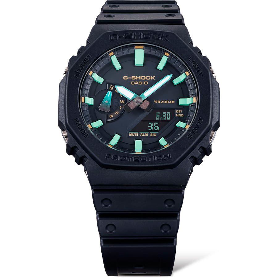 Мужские кварцевые аналогово-цифровые наручные часы. Серия G-Shock Classic. Противоударный пластиковый корпус с карбоновыми волокнами более прочный и в то же время более легкий, защищает механизм часов от повреждений и деформаций при ударах и вибрации. Циферблат подсвечивается светодиодом. Настройка продолжительности подсветки (1,5 или 3 секунды). Необритовое светонакопительное покрытие обеспечивает длительное послесвечение в темноте даже после кратковременного нахождения на свету. 12-ти и 24-х часовой формат времени. Секундомер с двумя точностями показаний: 1/100с (до 1ч) и 1с (после 1ч) и временем измерения 24ч. Сплит-хронограф. Таймер обратного отсчета от 1c до 24ч с автоповтором. Мировое время – 48 городов (31 часовой пояс), всемирное координированное время (UTC). Функция включения/отключения летнего времени. 5 ежедневных будильников, один с функцией повтора сигнала, ежечасный сигнал. Функции отключения/включения звука кнопок и перемещения стрелок для беспрепятственного просмотра информации на цифровых дисплеях. Автоматический календарь до 2099 года. Круглый пластиковый корпус, усиленный карбоновыми волокнами. Ремешок из полимерного пластика с классической застёжкой.