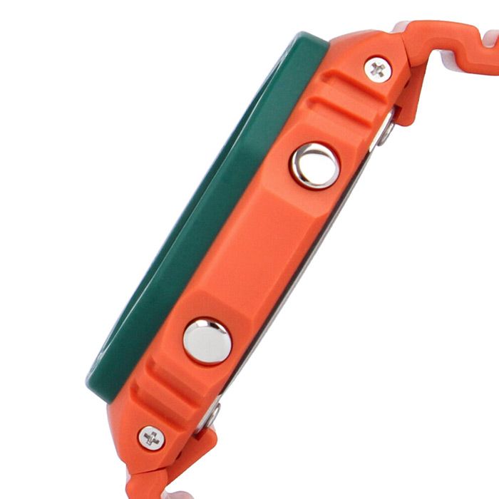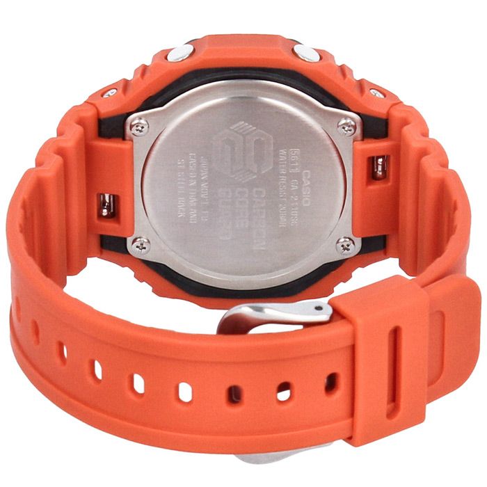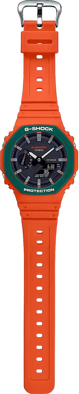 Мужские кварцевые аналого-цифровые наручные часы. Серия G-Shock. Противоударный пластиковый корпус с углеродными волокнами (структура Carbon Core Guard) более прочный и в то же время более легкий, защищает механизм часов от ударов и вибраций. Двойная светодиодная подсветка обеспечивает подсветку не только цифрового дисплея, но и аналогового циферблата. Настройка продолжительности подсветки 1,5 или 3 секунды, послесвечение. Светящееся покрытие стрелок обеспечивает длительное послесвечение в темноте после короткого воздействия света.12-ти и 24-х часовой формат отображения времени. Ретроградный стрелочный указатель для недели. Секундомер с точностью показаний 1/100 с (первый час) и 1 с (после первого часа) и временем измерения 24 часа. Режимы измерения: прошедшее время, промежуточное время, два финишных результата. Таймер обратного отсчета от 1 секунды до 24 часов с автоповтором. Мировое время - 31 часовой пояс (48 городов), всемирное координированное время (UTC), включение/отключение летнего времени. 5 ежедневных будильников, ежечасный сигнал. Функция перемещения стрелок для удобного просмотра информации на цифровом экране. Функция отключения/включения звука кнопок. Автоматический календарь до 2099 года. Чёрный циферблат с часовыми метками в виде штрихов, зелёный безель. Усиленный углеродными волокнами пластиковый восьмиугольный корпус оранжевого цвета. Размеры корпуса 48,5 мм на 45,4 мм, толщина 11,8 мм. Устойчивое к мелким механическим повреждениям минеральное стекло. Оранжевый пластиковый ремешок со стандартной застёжкой Buckle. Батарея рассчитана на 3 года. Водонепроницаемость 200WR (плавание и ныряние без акваланга). Вес около 51 г.
