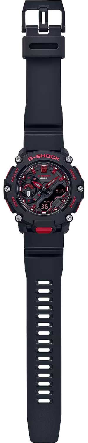 Мужские кварцевые аналого-цифровые наручные часы. Коллекция Casio G-Shock. Противоударный пластиковый корпус с углеродными волокнами (структура Carbon Core Guard) более прочный и, в то же время, более легкий, защищает внутренний модуль часов от повреждений и деформаций при ударах. Двойная светодиодная подсветка Super Illuminator обеспечивает подсветку не только аналогового циферблата, но и цифрового дисплея, настройка продолжительности подсветки 1,5 или 3 секунды, послесвечение. Необритовое светонакопительное покрытие стрелок обеспечивает длительное послесвечение в темноте после кратковременного воздействия света. 12-ти и 24-х часовой формат отображения времени. Секундомер с точностью показаний 1/100 секунды (первый час) и 1 секунда (после первого часа) и временем измерения 24ч. Режимы измерения: прошедшее время, промежуточное время, два финишных результата. Таймер обратного отсчета от 1с до 24ч (с интервалом в 1 секунду), 10-секундный сигнал об окончании обратного отсчета. Мировое время – 48 городов (31 часовой пояс), всемирное координированное время (UTC). Функция включения/отключения летнего времени. Переключение между домашним и мировым временем. Автоматический календарь до 2099 г. 5 ежедневных будильников, сигнал начала часа, продолжительность звучания сигнала 10 секунд. Функция отключения/включения звука кнопок. Функция перемещения стрелок для удобного просмотра информации на цифровом экране. Усиленный углеродными волокнами пластиковый корпус чёрного цвета. Размеры корпуса 47,1 мм на 50,8мм, толщина 12,8мм. Чёрный циферблат с ярко-красными стрелками и часовыми метками. Устойчивое к мелким механическим повреждениям минеральное стекло. Стальная задняя крышка. Чёрный пластиковый ремешок с классической застежкой buckle. . Батарея рассчитана на 3 года. Водонепроницаемость 200 WR (плавание и ныряние без акваланга). Вес около 57 г.