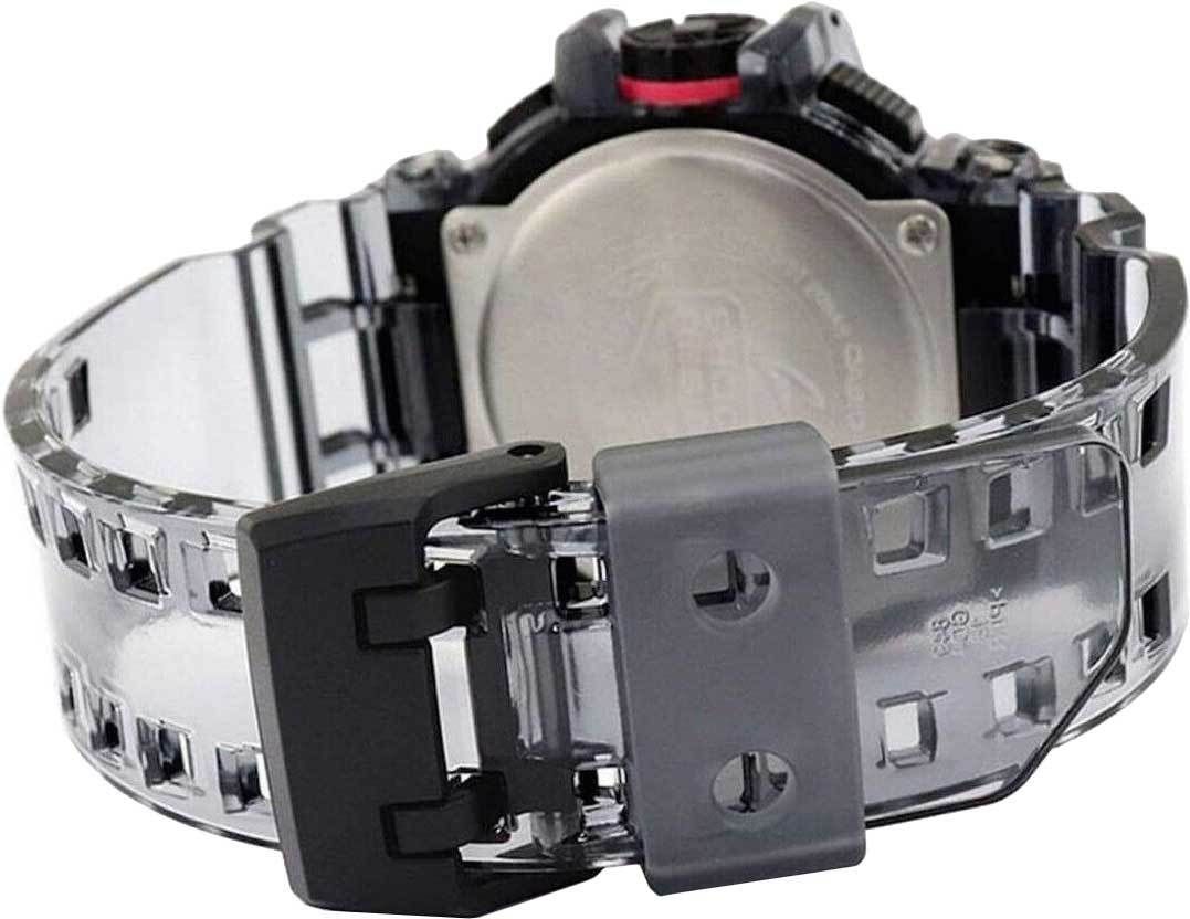 Мужские кварцевые аналого-цифровые наручные часы. Коллекция Casio G-Shock. Противоударный корпус защищает внутренний модуль часов от повреждений и деформаций при ударах. Cветодиодная подсветка, настройка продолжительности подсветки 1,5 или 3 секунды, послесвечение. Функция автоподсветки - при недостаточном освещении поворот руки обеспечит автоматическое включение подсветки. 12-ти и 24-х часовой формат отображения времени. Секундомер с точностью показаний 1/100 секунды и временем измерения 24 часа. Режимы измерения: прошедшее время, промежуточное время, два финишных результата, автостарт. Таймер обратного отсчета от 1 мин до 1 ч (с интервалом в 1 минуту). Мировое время – 48 городов (31 часовой пояс), всемирное координированное время (UTC). Функция включения/отключения летнего времени. Автоматический календарь до 2099 г. 5 независимых будильников (1 с повтором сигнала); сигнал начала часа. Функция отключения/включения звука кнопок. Функция перемещения стрелок. Функция колеса прокрутки - легко настраивать время, будильник и таймер. Круглый корпус из полимерного полупрозрачного пластика чёрного цвета. Минеральное стекло устойчивое к мелким механическим повреждениям. Полупрозрачный пластиковый ремешок с классической застежкой buckle. Водонепроницаемость 200 WR (плавание и ныряние без акваланга). Вес около 70 г.