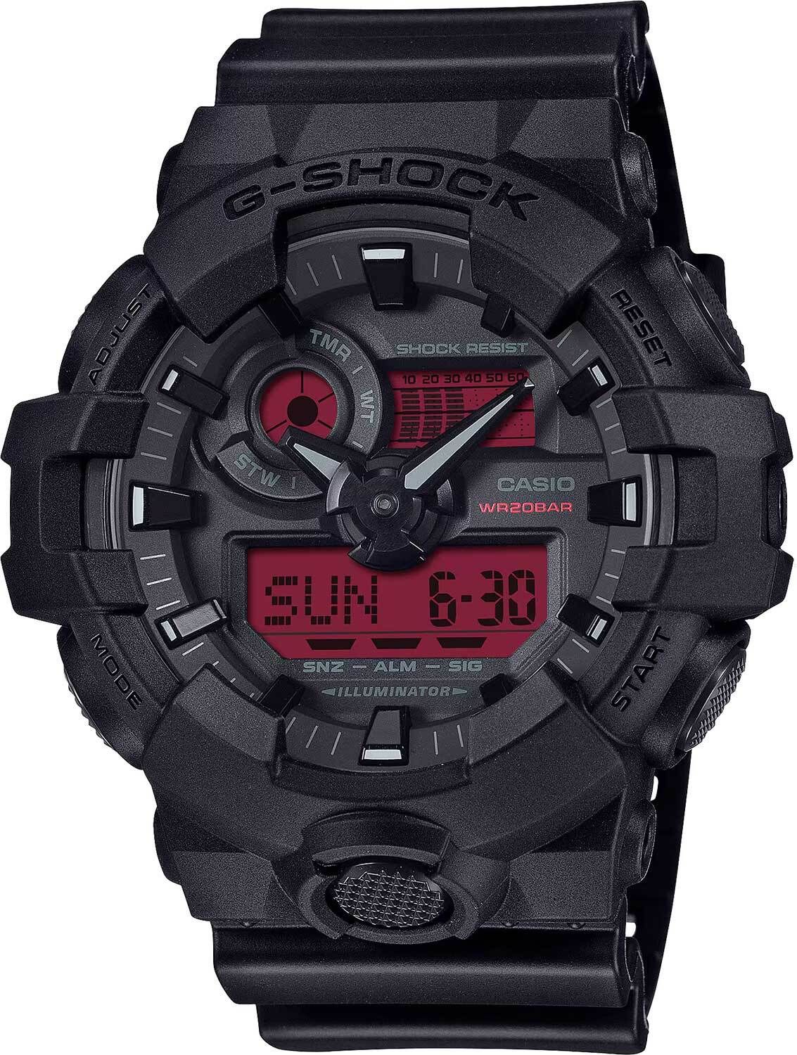 Мужские кварцевые часы с аналого-цифровым отображением времени. Серия Casio G-Shock. Отличительной особенностью серии является яркий красный дисплей часов. Противоударный корпус защищает внутренний модуль часов от повреждений и деформаций при ударах. Циферблат подсвечивается ярким светодиодом, настройка продолжительности подсветки 1,5 или 3 секунды, послесвечение. Светонакопительное покрытие стрелок обеспечивает длительное послесвечение в темноте после кратковременного воздействия света. 12-ти и 24-х часовой формат отображения времени. Секундомер с точностью показаний 1/100 секунды и временем измерения 24 часа. Режимы измерения: прошедшее время, промежуточное время, два финишных результата. Быстрое включение секундомера из режима Текущего времени. Таймер обратного отсчета от 1 мин до 60 мин (с интервалом в 1 минуту). Мировое время – 48 городов (31 часовой пояс), всемирное координированное время (UTC), переключение между домашним и мировым временем, функция включения/отключения летнего времени. Автоматический календарь до 2099 г. 5 ежедневных будильников (1 с функцией повтора сигнала Snooze); сигнал начала часа. Функция отключения/включения звука кнопок Mute. Функция перемещения стрелок для удобного просмотра информации на цифровых дисплеях. Круглый корпус из полимерного пластика чёрного цвета. Габаритные размеры корпуса 53,4 мм на 57,5мм, толщина 18,5мм. Минеральное стекло устойчивое к мелким механическим повреждениям. Чёрный пластиковый ремешок с классической застежкой buckle. Батарея рассчитана на 5 лет. Водонепроницаемость 200WR (плавание и ныряние без акваланга). Вес около 75 г.