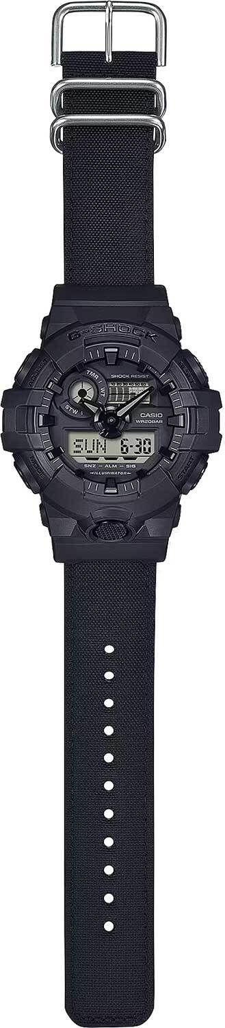 Мужские кварцевые аналогово-цифровые наручные часы. Коллекция Casio G-Shock. Противоударный пластиковый корпус защищает внутренний модуль часов от повреждений и деформаций при ударах. Двойная светодиодная подсветка Super Illuminator обеспечивает подсветку не только аналогового циферблата, но и цифрового дисплея, настройка продолжительности подсветки 1,5 или 3 секунды, послесвечение. 12-ти и 24-х часовой формат отображения времени. Секундомер с точностью показаний 1/100 секунды и временем измерения 24ч. Режимы измерения: прошедшее время, промежуточное время, два финишных результата, быстрое включение секундомера из режима Текущего времени. Таймер обратного отсчета от 1 мин до 1 ч (с интервалом в 1 минуту). Мировое время – 48 городов (31 часовой пояс), всемирное координированное время (UTC). Функция включения/отключения летнего времени. Переключение между домашним и мировым временем. Автоматический календарь до 2099 г. 5 ежедневных будильников (1 с повтором сигнала), сигнал начала часа. Функция отключения/включения звука кнопок. Функция перемещения стрелок для удобного просмотра информации на цифровом экране. Круглый пластиковый корпус чёрного цвета. Размеры корпуса 53,4 мм на 57,5мм, толщина 18,5мм. Чёрный циферблат. Светонакопительное покрытие стрелок обеспечивает длительное послесвечение в темноте даже после кратковременного воздействия света. Устойчивое к мелким механическим повреждениям минеральное стекло. Стальная задняя крышка. Чёрный тканевый ремешок Cordura с классической застежкой buckle. Ткань Кордура (CORDURA®) - плотная нейлоновая ткань производства компании INVISTA, отличается повышенной прочностью на разрыв, устойчивостью к истиранию и долговечностью. Батарея рассчитана на 5 лет. Водонепроницаемость 200 WR (плавание и ныряние без акваланга). Вес около 76 г.