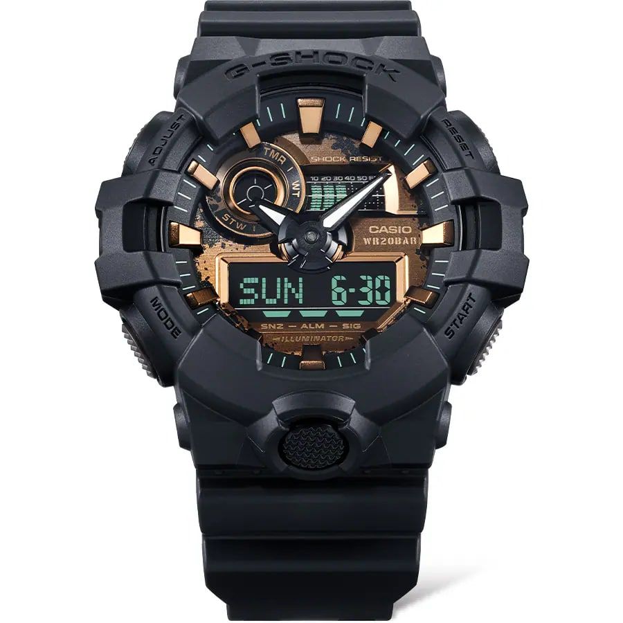 Мужские кварцевые аналогово-цифровые наручные часы. Серия G-Shock Classic. Ударопрочная конструкция защищает механизм часов от ударов и вибрации. 12-ти и 24-х часовой формат времени. Циферблат подсвечивается светодиодом. Секундомер с точностью показаний 1/100 с и временем измерения 24 ч. Таймер обратного отсчета от 1 мин до 1 ч с автоповтором. Mировое время – 48 городов (31 часовой пояс), всемирное координированное время (UTC). 5 ежедневных будильников, один с функцией повтора сигнала, ежечасный сигнал. Включение/выключение звука кнопок. Функция перемещения стрелок для беспрепятственного просмотра информации на цифровых дисплеях. Автоматический календарь до 2099 года. Круглый корпус из полимерного пластика. Пластиковый ремешок с классической застёжкой.