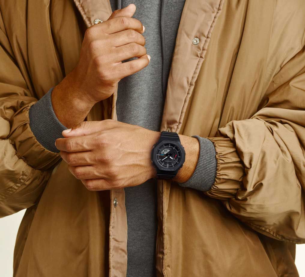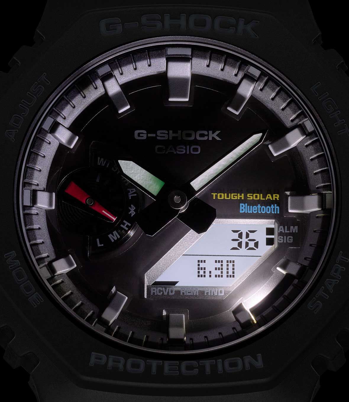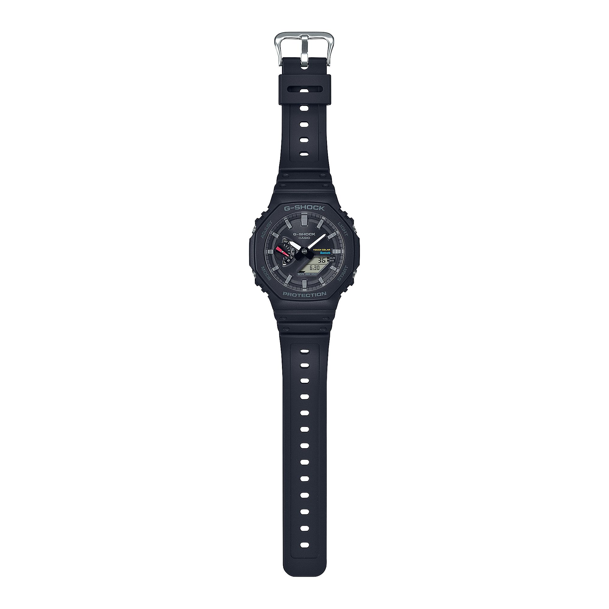 Мужские кварцевые аналого-цифровые часы на солнечной батарее. Серия G-Shock. Противоударный пластиковый корпус с углеродными волокнами (структура Carbon Core Guard) защищает внутренний модуль часов от повреждений и деформаций при ударах и вибрации. Питание от солнечной энергии (технология Tough Solar) — источником питания служит светочувствительная панель и аккумулятор, заряжаемый при попадании солнечных лучей на циферблат часов. Индикатор уровня заряда батареи. Функция автоматического сохранения энергии. Время работы аккумулятора без подзарядки около 7 месяцев, при включенной функции сохранения энергии около 18 месяцев. Часы оснащены беспроводной технологией Bluetooth® со сверхнизким потреблением энергии для синхронизации со смартфоном. При подключении к смартфону часы автоматически корректируют текущее время, в том числе переход на зимнее/летнее время, копируют настройки мирового времени более чем для 300 городов и получают доступ к ряду полезных функций. Двойная светодиодная подсветка (циферблата и ЖК-дисплея) с функцией послесвечения, настройка продолжительности подсветки 1,5 или 3 с. Секундомер с точностью измерения 1/100 секунды (в течение первого часа), 1 секунда (через 1 час) и временем измерения 24ч. Режимы измерения: прошедшее время, время прохождения части и круга дистанции. Таймер обратного отсчета от 1 секунды до 60 минут. Сигнал оповещения об окончании обратного отсчета звучит в течение 10 секунд. 5 ежедневных будильников, ежечасный сигнал. Мировое время - 38 городов (38 часовых поясов), всемирное координированное время (UTC), автоматический переход на зимнее и летнее время, возможность включения/отключения данной функции, переключение между домашним и мировым временем. 12-ти и 24-х часовой формат отображения времени. Автоматический календарь до 2099 г, отображение дней недели на шести языках. Включение/выключение звука кнопок. Функция перемещения стрелок для удобного просмотра информации на цифровом экране. Функция поиска телефона. Усиленный углеродными волокнами пластиковый корпус чёрного цвета. Размер корпуса 48,5 мм на 45,4 мм, толщина 11,9 мм. Центральные часовая и минутная стрелки. Чёрный циферблат с часовыми метками в виде штрихов. Стрелки и метки с люминесцентным покрытием, которое светится в темноте после непродолжительного воздействия света. Минеральное стекло устойчивое к мелким механическим повреждениям. Ремешок из полимерного пластика чёрного цвета, стандартная застёжка Buckle. Водонепроницаемость 200WR (плавание и погружение без акваланга). Вес около 52 г.