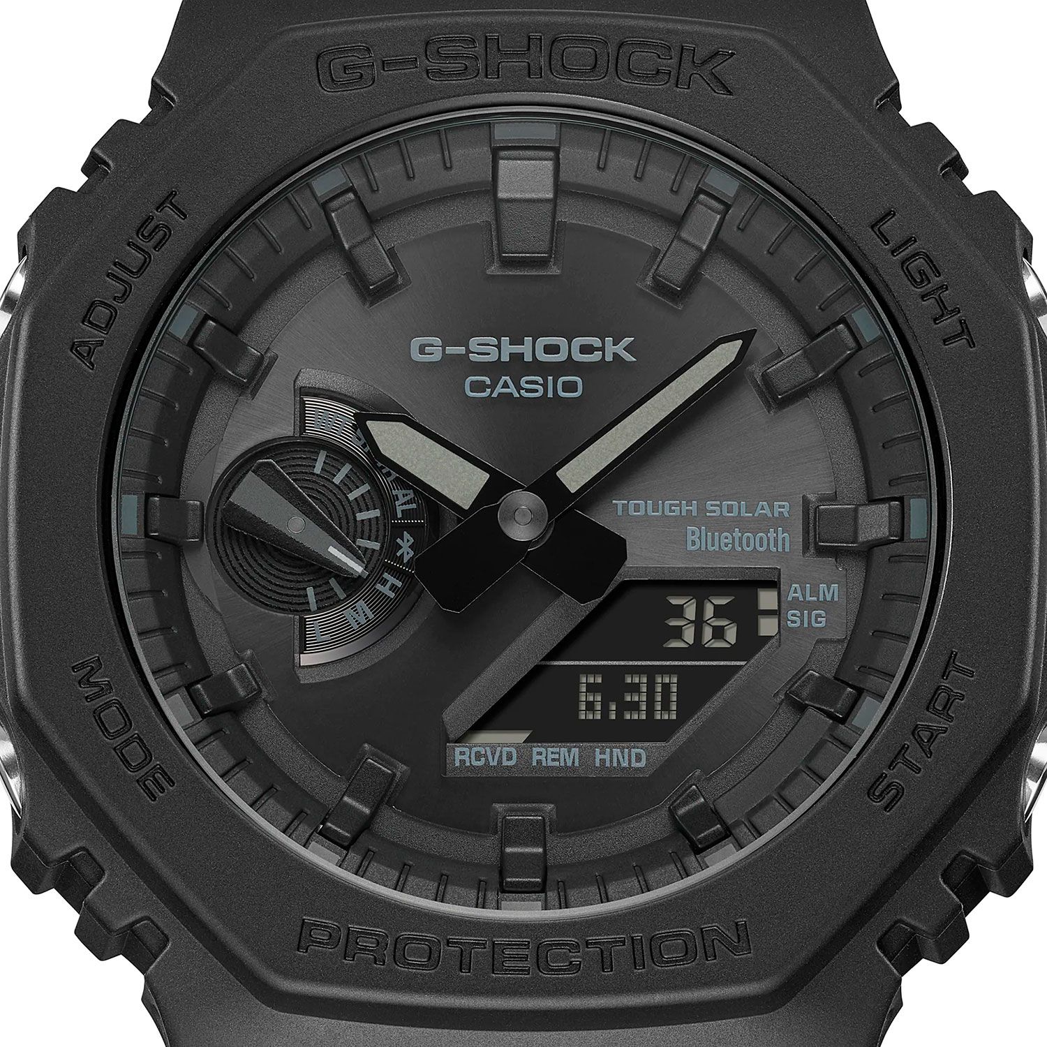 Мужские кварцевые аналого-цифровые часы на солнечной батарее. Серия G-Shock. Противоударный пластиковый корпус с углеродными волокнами (структура Carbon Core Guard) защищает внутренний модуль часов от повреждений и деформаций при ударах и вибрации. Питание от солнечной энергии (технология Tough Solar) — источником питания служит светочувствительная панель и аккумулятор, заряжаемый при попадании солнечных лучей на циферблат часов. Индикатор уровня заряда батареи. Функция автоматического сохранения энергии. Время работы аккумулятора без подзарядки около 7 месяцев, при включенной функции сохранения энергии около 18 месяцев. Часы оснащены беспроводной технологией Bluetooth® со сверхнизким потреблением энергии для синхронизации со смартфоном. При подключении к смартфону часы автоматически корректируют текущее время, в том числе переход на зимнее/летнее время, копируют настройки мирового времени более чем для 300 городов и получают доступ к ряду полезных функций. Двойная светодиодная подсветка (циферблата и ЖК-дисплея) с функцией послесвечения, настройка продолжительности подсветки 1,5 или 3 с. Секундомер с точностью измерения 1/100 секунды (в течение первого часа), 1 секунда (через 1 час) и временем измерения 24ч. Режимы измерения: прошедшее время, время прохождения части и круга дистанции. Таймер обратного отсчета от 1 секунды до 60 минут. Сигнал оповещения об окончании обратного отсчета звучит в течение 10 секунд. 5 ежедневных будильников, ежечасный сигнал. Мировое время - 38 городов (38 часовых поясов), всемирное координированное время (UTC), автоматический переход на зимнее и летнее время, возможность включения/отключения данной функции, переключение между домашним и мировым временем. 12-ти и 24-х часовой формат отображения времени. Автоматический календарь до 2099 г, отображение дней недели на шести языках. Включение/выключение звука кнопок. Функция перемещения стрелок для удобного просмотра информации на цифровом экране. Функция поиска телефона. Усиленный углеродными волокнами пластиковый корпус чёрного цвета. Размер корпуса 48,5 мм на 45,4 мм, толщина 11,9 мм. Центральные часовая и минутная стрелки. Чёрный циферблат с часовыми метками в виде штрихов. Стрелки и метки с люминесцентным покрытием, которое светится в темноте после непродолжительного воздействия света. Минеральное стекло устойчивое к мелким механическим повреждениям. Ремешок из полимерного пластика чёрного цвета, стандартная застёжка Buckle. Водонепроницаемость 200WR (плавание и погружение без акваланга). Вес около 52 г.