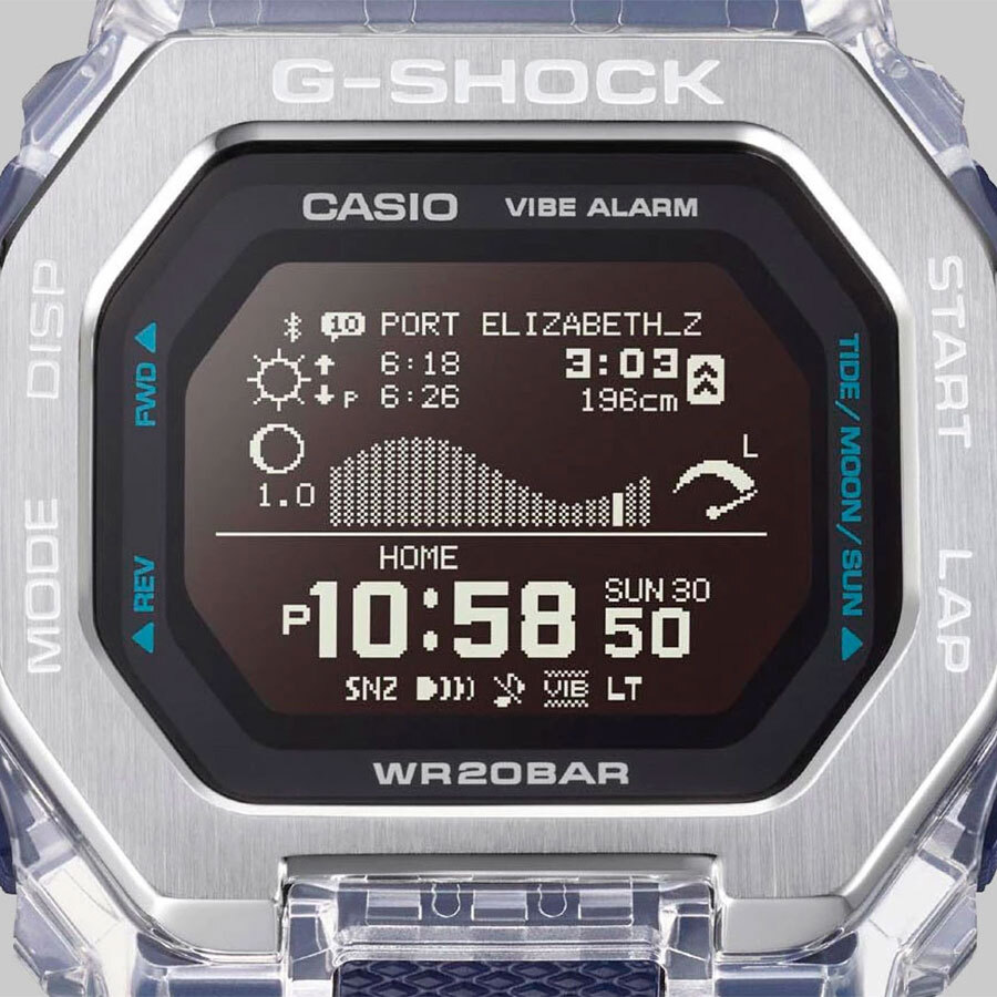 Мужские кварцевые электронные наручные часы. Серия Casio G-Shock. Противоударный корпус защищает механизм часов от ударов и вибрации. Светодиодная автоматическая подсветка -при недостаточной освещенности поворот руки включит яркую подсветку часов. Часы оснащены беспроводной технологией Bluetooth® со сверхнизким потреблением энергии для синхронизации со смартфоном. При подключении к смартфону часы корректируют текущее время, дату и мировое время. 12-ти и 24-х часовой формат отображения времени. Секундомер с точностью показаний 1с и временем измерения 100 ч. Режимы измерения: прошедшее время, промежуточное время. Возможность установить 5 последовательных таймеров. Таймер обратного отсчета от 1с до 1ч с автоповтором. Количество повторений таймера устанавливается от 1 до 20. Мировое время 38 городов (38 часовых поясов), всемирное координированное время (UTC). Автоматический переход на зимнее и летнее время, возможность включения/отключения данной функции. Функция тренировки отображает данные о расстоянии, скорости, темпе, сожженных калориях (до 100 пробежек, до 140 кругов за одну пробежку). Шагомер - диапазон измерения и отображения от 0 до 99 999 шагов. Функции вибро-уведомления, поиска телефона, настройки функции тренировки. Управление данными журнала тренировок. Акселерометр- отображение скорости. Отображение сведений о приливах и отливах. Время восхода и захода Солнца. 4 ежедневных будильника, один с функцией повтора сигнала Snooze. Автоматический календарь до 2099 года. Функция энергосбережения - дисплей гаснет для экономии энергии на 3 часа каждый день. Функция выключения звука нажатия кнопок (Mute). Прямоугольный корпус из полупрозрачного полимерного пластика. Размер корпуса 46 мм на 50,9мм, толщина 14,7мм. Стальной безель. Устойчивое к мелким механическим повреждениям минеральное стекло. Синий пластиковый ремешок с классической застёжкой buckle и прорезями, которые улучшают прилегание к запястью и позволяют воде или поту легко выходить наружу. Батарея рассчитана на 2 года. Водонепроницаемость 200WR (плавание и погружение без акваланга). Вес около 66 г.