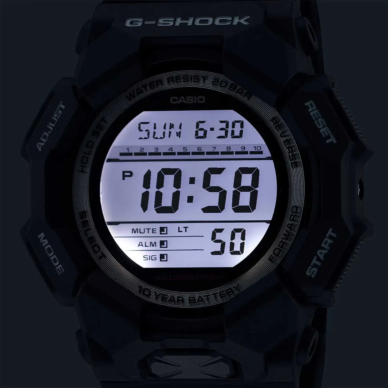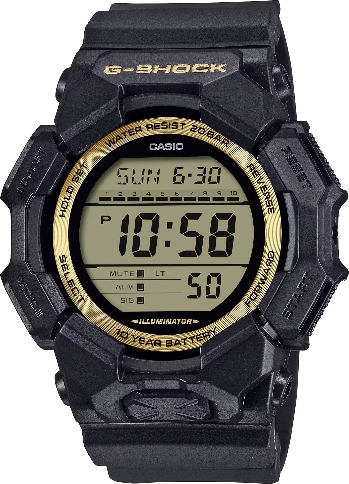 Мужские кварцевые наручные часы с цифровым отображением времени. Серия G-Shock. Новинка G-Shock в черном матовом корпусе с деталями золотистого цвета. Противоударный корпус из полимерного пластика с углеродными волокнами (структура Carbon Core Guard) более прочный и в то же время более легкий, защищает механизм часов от ударов и вибраций. Циферблат подсвечивается светодиодом с функцией послесвечения. 12-ти и 24-х часовой формат отображения времени. Секундомер с точностью показаний 1/100 с и временем измерения 24 часа. Режимы измерения: прошедшее время, промежуточное время, два финишных результата. Таймер обратного отсчета от от 1 с до 24 ч. Мировое время - 31 часовой пояс (48 городов), всемирное координированное время UTC, включение/отключение летнего времени. Переключение между домашним и мировым временем. Возможность выбора до 4 городов в качестве избранных. 5 будильников, ежечасный сигнал. Функция отключения/включения звука кнопок. Автоматический календарь до 2099 года. Усиленный углеродными волокнами пластиковый корпус чёрного цвета. Размер корпуса 51,2 мм на 55мм, толщина 17,4мм. Устойчивое к мелким механическим повреждениям минеральное стекло. Чёрный ремешок из полимерного пластика со стандартной застёжкой Buckle. Батарея рассчитана на 10 лет. Водонепроницаемость 200WR (плавание и ныряние без акваланга). Вес около 65 г.