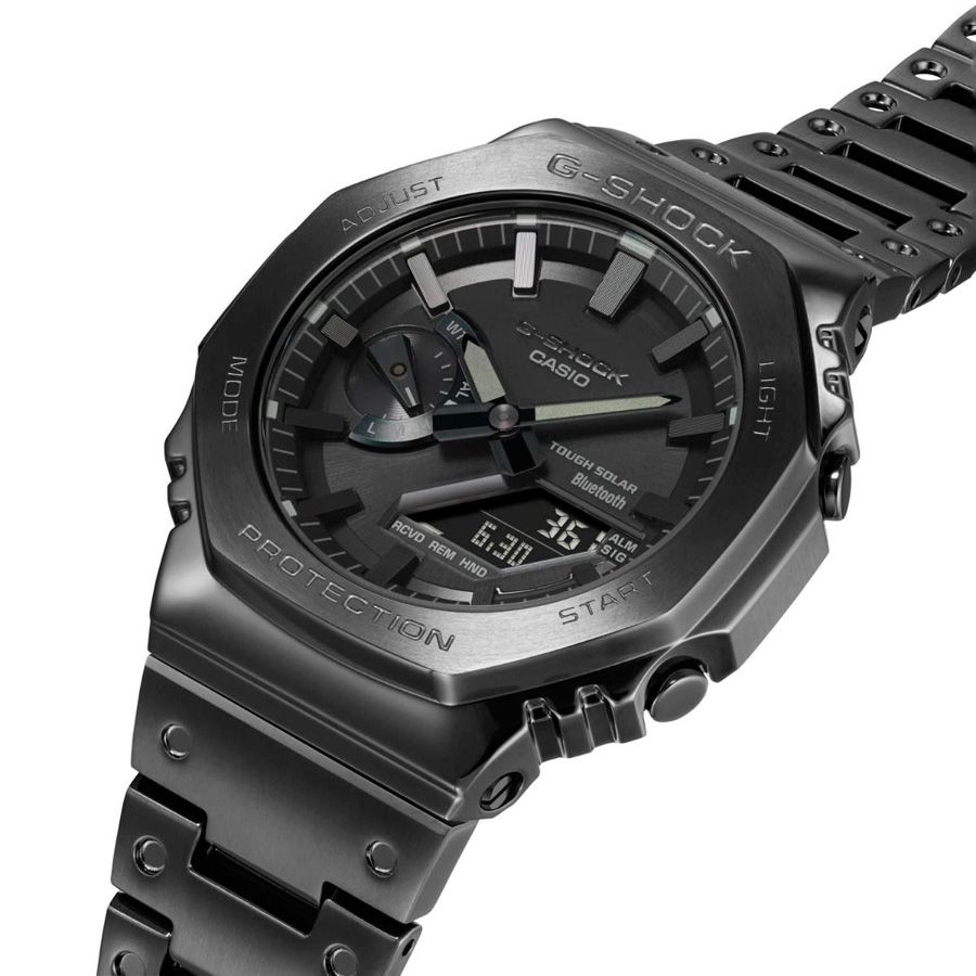 Мужские кварцевые аналого-цифровые наручные часы. Серия G-Shock. Противоударный корпус защищает механизм часов от ударов и вибрации. Модуль часов снабжен элементами из материала alphaGEL, который еще лучше защищает часы от сотрясения и вибрации. АlphaGEL представляет собой гибкую силиконовую прослойку, оказывающую амортизирующий эффект. Питание от солнечной энергии Tough Solar - солнечной батарейки. Индикатор уровня заряда батареи. Функция автоматического сохранения энергии. Время работы аккумулятора без подзарядки около 7 месяцев, при включенной функции сохранения энергии около 18 месяцев. Циферблат подсвечивается светодиодом. Функция парный иллюминатор обеспечивает подсветку не только аналогового циферблата, но и цифрового дисплея. Настраиваемое послесвечение 1,5 с или 3с. Необритовое светонакопительное покрытие стрелок обеспечивает длительное послесвечение в темноте даже после кратковременного воздействия на света. 12-ти и 24-х часовой формат отображения времени. Секундомер с точностью показаний 1/100с (до 1ч) и 1с (после 1ч) и временем измерения 24ч. SPLIT-хронограф. Таймер обратного отсчета от 1с до 1ч. Мировое время – 38 городов (38 часовых поясов), всемирное координированное время (UTC). Функция включения/отключения летнего времени. Переключение между домашним и мировым временем. Беспроводная технология Bluetooth® со сверхнизким потреблением энергии для синхронизации со смартфоном. При подключении к смартфону часы автоматически корректируют текущее время, в том числе переход на зимнее/летнее время, копируют настройки мирового времени более чем для 300 городов. Функция поиска телефона. Функция отключения/включения звука кнопок. Функция перемещения стрелок для удобного просмотра информации на цифровом экране. 5 ежедневных будильников, почасовой сигнал времени. Автоматический календарь до 2099 г, отображение дней недели на шести языках. Чёрный циферблат с метками в виде штрихов. Устойчивое к мелким механическим повреждениям минеральное стекло. Корпус выполнен из нержавеющей стали с IP покрытием чёрного цвета. Размеры корпуса 50 мм на 44 мм, толщина 13 мм. Стальной браслет с покрытием чёрного цвета, раскладывающаяся тройная застежка. Задняя крышка с винтовым фиксатором. Водонепроницаемость 200 WR (плавание и ныряние без акваланга). Вес около 165 г.