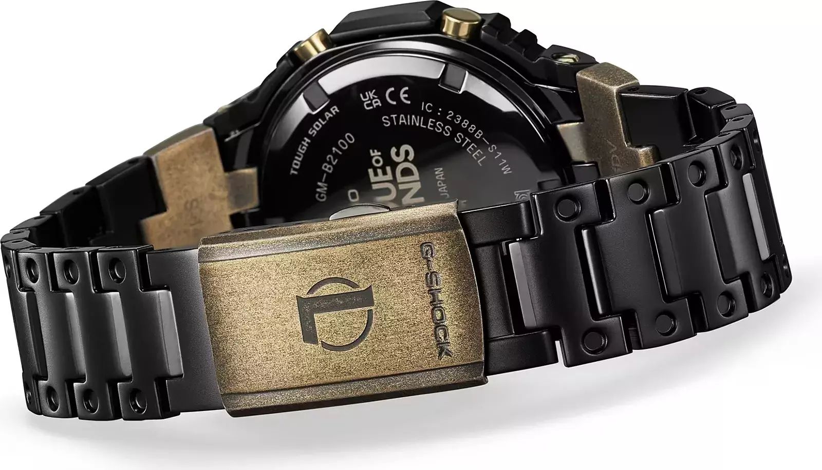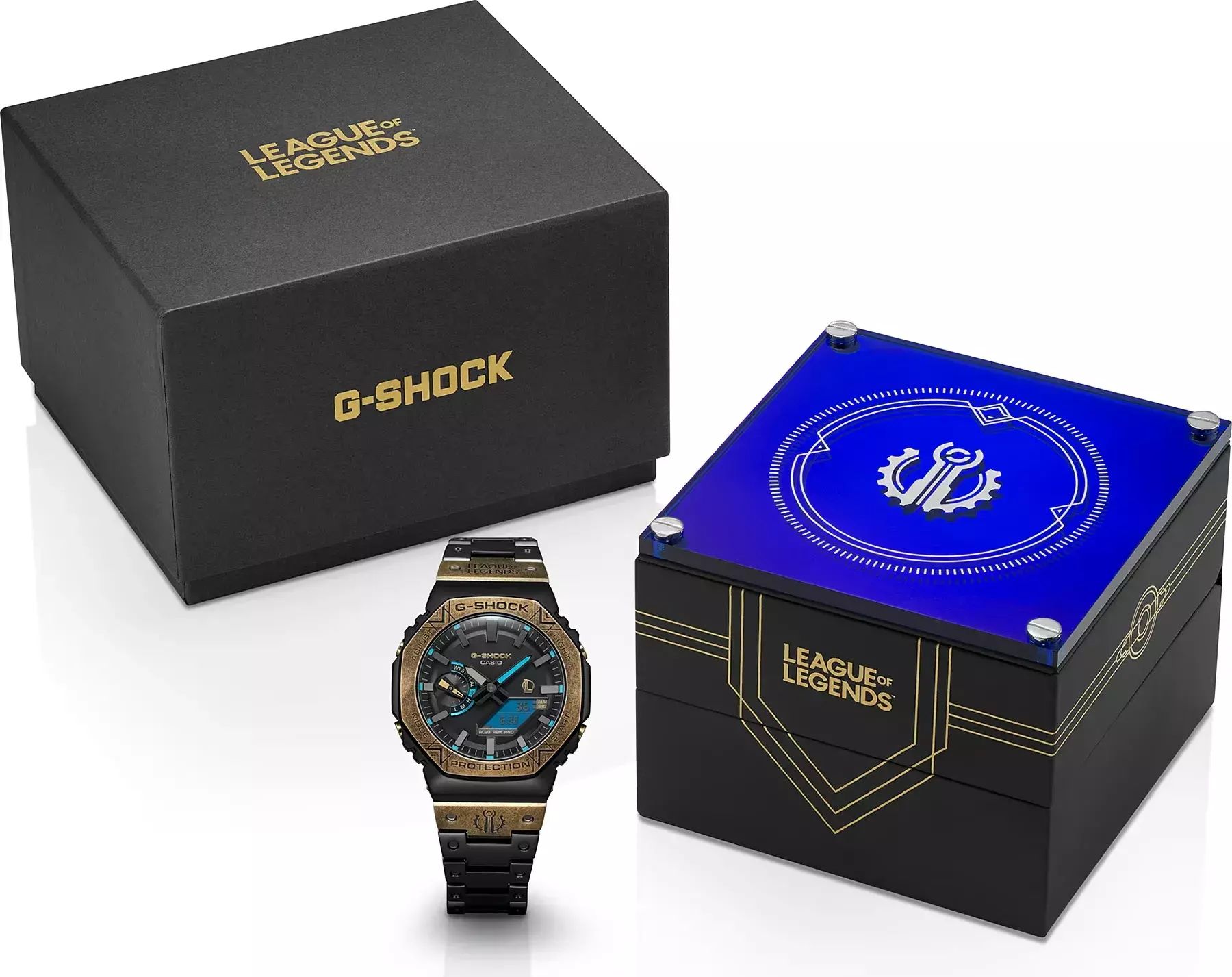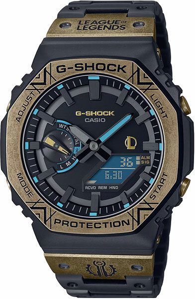 Мужские кварцевые аналого-цифровые наручные часы. Серия G-Shock Limited - ограниченная серия, выпущенная в сотрудничестве G-Shock с онлайн-игрой League of Legends (LoL), которую выпустила компания Riot Games в 2009 году. Дизайн часов выполнен в стилистике игры League of Legends: черный стальной матовый корпус с безелем золотистого оттенка с эффектом старения и магическими рунами на нем. На первом звене браслета с одной стороны нанесен логотип игры League of Legends, а с другой стороны нанесён герб города Пилтовер - одного из самых прогрессивных городов во вселенной League of Legends. На задней стальной крышке часов также выгравирован логотип игры League of Legends. Противоударный корпус защищает механизм часов от ударов и вибрации. Модуль часов снабжен элементами из материала alphaGEL, который еще лучше защищает часы от сотрясения и вибрации. АlphaGEL представляет собой гибкую силиконовую прослойку, оказывающую амортизирующий эффект. Питание от солнечной энергии (технология Tough Solar) - источником питания служит светочувствительная панель и аккумулятор, заряжаемый при попадании солнечного света на циферблат часов. Индикатор уровня заряда батареи. Функция автоматического сохранения энергии. Время работы аккумулятора без подзарядки около 7 месяцев, при включенной функции сохранения энергии около 18 месяцев. Двойная светодиодная подсветка обеспечивает подсветку не только аналогового циферблата, но и цифрового дисплея. Настраиваемое послесвечение 1,5 с или 3с, послесвечение. Необритовое светонакопительное покрытие стрелок и меток обеспечивает длительное послесвечение в темноте даже после кратковременного воздействия света. 12-ти и 24-х часовой формат отображения времени. Секундомер с точностью измерения 1/100 секунды (в течение первого часа) и 1 секунда (через 1 час) и временем измерения 24ч. Режимы измерения: прошедшее время, время прохождения части и круга дистанции. Таймер обратного отсчета от 1с до 1часа с интервалом в 1 секунду. Мировое время – 38 городов (38 часовых поясов), всемирное координированное время (UTC). Функция включения/отключения летнего времени, переключение между домашним и мировым временем. Синхронизация со смартфоном с помощью беспроводной технологии Bluetooth® автоматически корректирует текущее время и позволяет получить доступ к ряду функций часов. Функция поиска телефона. Функция отключения/включения звука кнопок. Функция перемещения стрелок для удобного просмотра информации на цифровом дисплее. 5 ежедневных будильников, почасовой сигнал времени. Автоматический календарь до 2099 г, возможность отображения дней недели на шести языках. Чёрный циферблат с метками в виде штрихов. Устойчивое к мелким механическим повреждениям минеральное стекло. Восьмиугольный корпус из нержавеющей стали с покрытием чёрного цвета. Размеры корпуса 49,5 мм на 44,4 мм, толщина 12,8 мм. Завинчивающаяся задняя крышка. Браслет из нержавеющей стали с IP покрытием (повышает устойчивость к царапинам) чёрного цвета, раскладывающаяся тройная застежка. Водонепроницаемость 200WR (плавание и ныряние без акваланга). Вес около 165 г. Часы упакованы в дизарнейский кейс, украшенный логотипом игры League of Legends и гербом города Пилтовер.