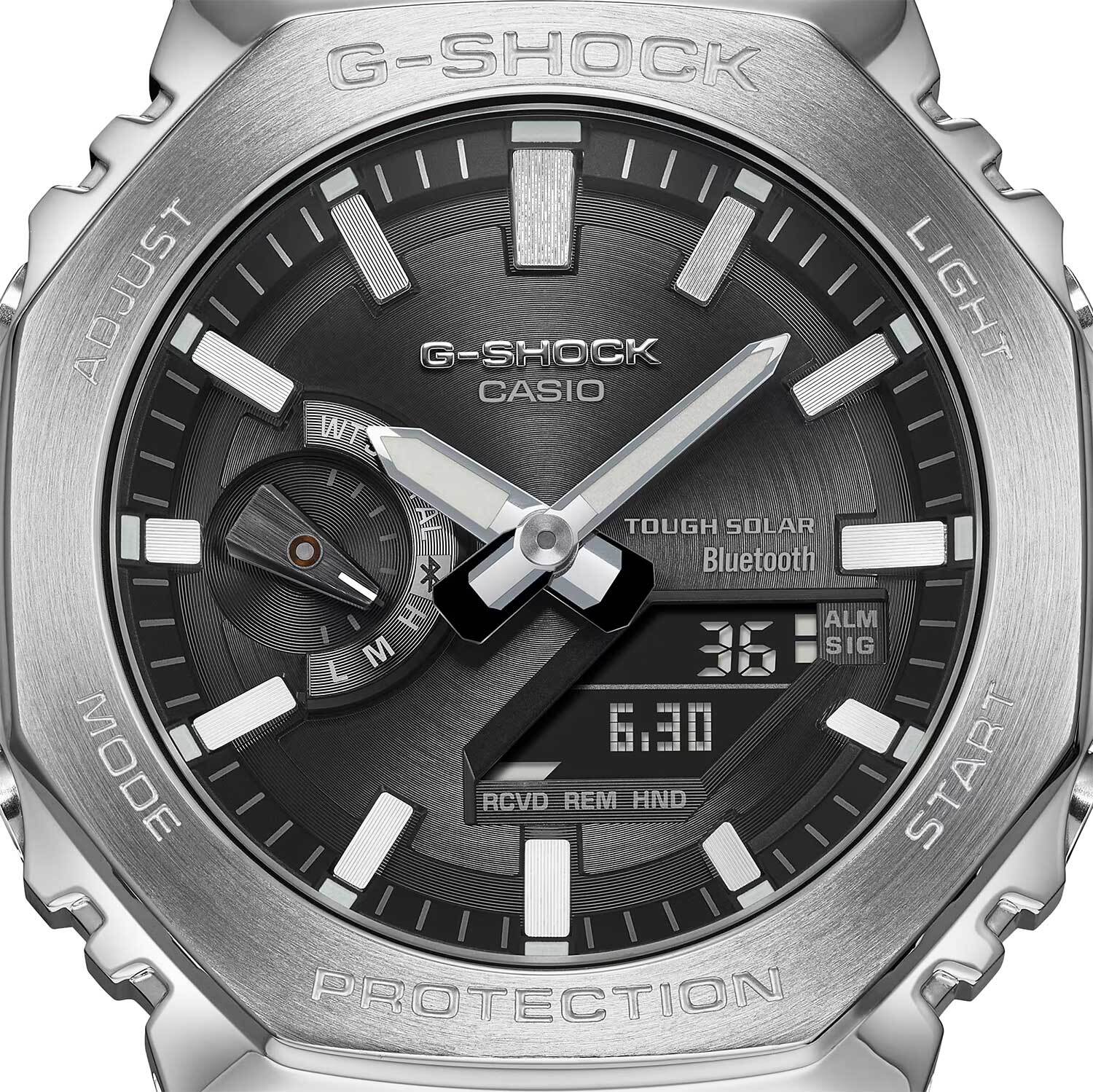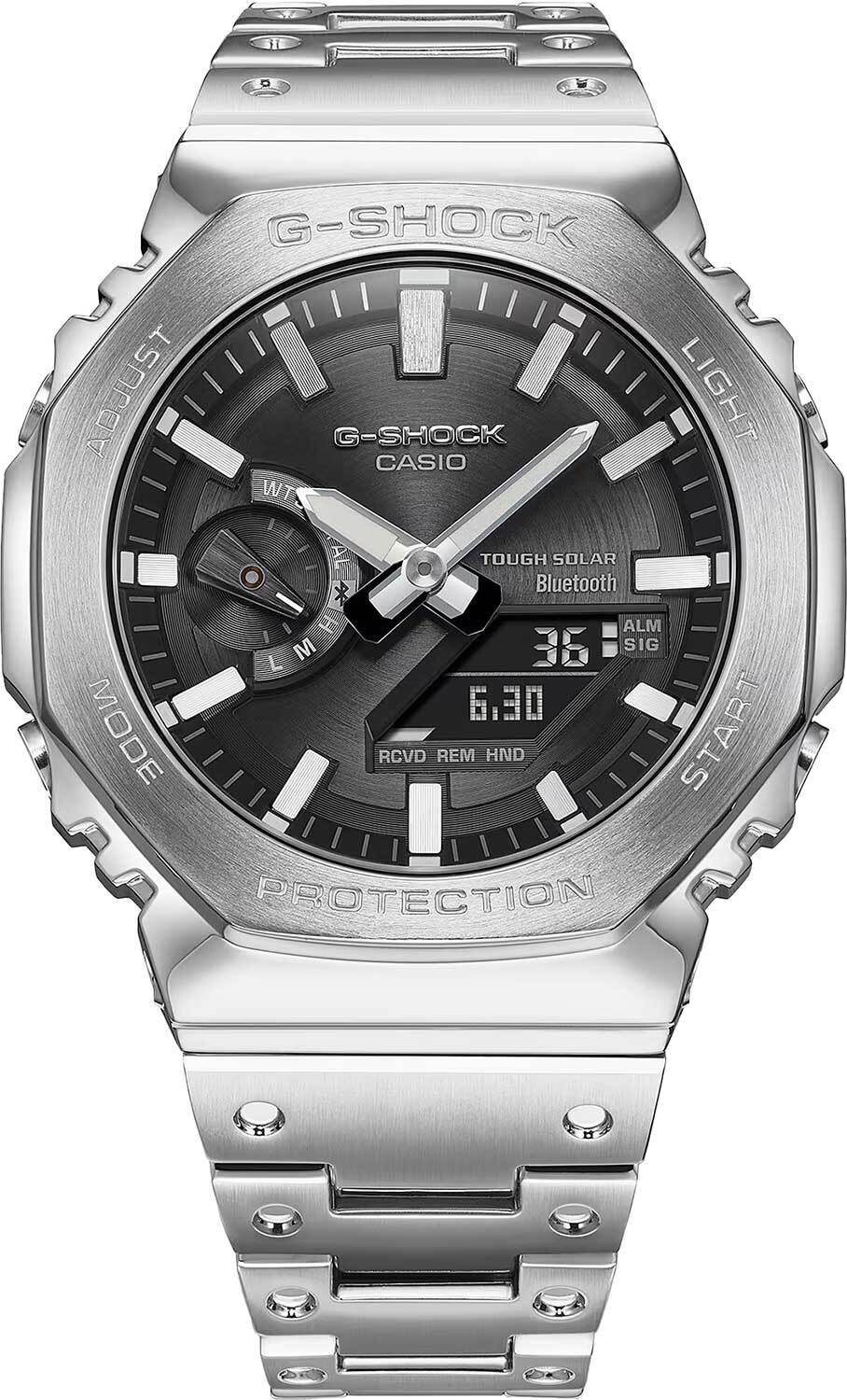 Мужские кварцевые аналого-цифровые наручные часы. Серия G-Shock. Противоударный корпус защищает механизм часов от ударов и вибрации. Питание от солнечной энергии (технология Tough Solar) - источником питания служит светочувствительная панель и аккумулятор, заряжаемый при попадании солнечного света на циферблат часов. Индикатор уровня заряда батареи. Функция автоматического сохранения энергии. Время работы аккумулятора без подзарядки около 7 месяцев, при включенной функции сохранения энергии около 18 месяцев. Двойная светодиодная подсветка обеспечивает подсветку не только аналогового циферблата, но и цифрового дисплея. Настраиваемое послесвечение 1,5 с или 3с, послесвечение. Необритовое светонакопительное покрытие стрелок обеспечивает длительное послесвечение в темноте даже после кратковременного воздействия света. 12-ти и 24-х часовой формат отображения времени. Секундомер с точностью показаний 1/100с (в течение первого часа) и 1с (через 1 час) и временем измерения 24ч. Режимы измерения: прошедшее время, время прохождения части и круга дистанции. Таймер обратного отсчета от 1с до 1часа с интервалом в 1 секунду. Мировое время – 38 городов (38 часовых поясов), всемирное координированное время (UTC). Автоматический переход на зимнее и летнее время, возможность включения/отключения данной функции, переключение между домашним и мировым временем. Часы оснащены беспроводной технологией Bluetooth® со сверхнизким потреблением энергии для синхронизации со смартфоном. При подключении к смартфону часы автоматически корректируют текущее время, в том числе переход на зимнее/летнее время, копируют настройки мирового времени более чем для 300 городов и позволяет получить доступ к ряду полезных функций часов. Функция поиска телефона. Функция отключения/включения звука кнопок. Функция перемещения стрелок для удобного просмотра информации на цифровых дисплеях. 5 ежедневных будильников, почасовой сигнал времени. Автоматический календарь до 2099 г, отображение дней недели на шести языках. Чёрный циферблат с часовыми метками в виде штрихов. Устойчивое к мелким механическим повреждениям минеральное стекло. Восьмиугольный корпус из нержавеющей стали. Размер корпуса 49,5 мм на 44,4 мм, толщина 12,8 мм. Завинчивающаяся задняя крышка. Браслет из нержавеющей стали с раскладывающейся тройной застежкой,. Водонепроницаемость 200WR (плавание и ныряние без акваланга). Вес около 165 г.