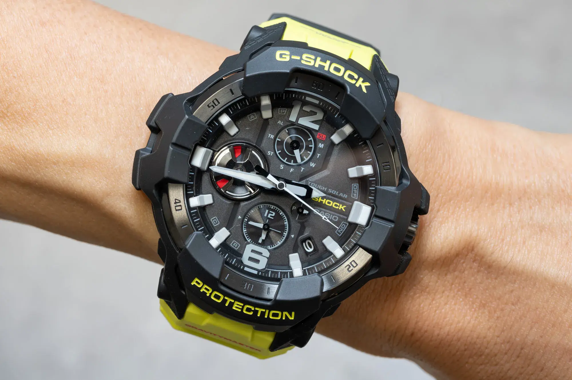 Мужские кварцевые аналоговые часы на солнечной батарее. Серия G-Shock Master of G Gravitymaster. Дизайн часов вдохновлен приборной панелью самолета. Часы предназначены для работы в самых сложных условиях. Противоударный пластиковый корпус с углеродными волокнами (структура Carbon Core Guard) более прочный и, в то же время, более легкий, защищает внутренний модуль часов от повреждений и деформаций при ударах и вибрации, обеспечивает жесткость и коррозионную стойкость. Питание от солнечной энергии (технология Tough Solar) - источником питания служит светочувствительная панель и аккумулятор, заряжаемый при попадании солнечного света на циферблат часов. Запас хода при полном заряде аккумулятора до 5 месяцев, при включенной функции сохранения энергии до 18 месяцев. Часы оснащены беспроводной технологией Bluetooth® со сверхнизким потреблением энергии для синхронизации со смартфоном. При подключении к смартфону часы автоматически корректируют текущее время и получают доступ к ряду полезных функций. Светодиодная подсветка (Super Illuminator) с функцией послесвечения. Секундомер с точностью измерения 1 с и временем измерения 24ч. Режимы измерения: прошедшее время, промежуточное время. Таймер обратного отсчета от 1 минуты до 24 часов. Ежедневный будильник, ежечасный сигнал. Отображение времени во втором часовом поясе. 12-ти и 24-х часовой формат отображения времени. Автоматический календарь до 2099 года. Окошко даты в позиции между метками 4 и 5 ч. Стрелочный указатель дня недели на дополнительном малом циферблате в позиции 12 ч. Индикатор заряда батареи. Функция сохранения энергии (в темноте стрелки останавливаются для экономии энергии). Функция поиска телефона. Журнал полетов. Усиленный углеродными волокнами корпус из биопластика (изготавливается из возобновляемых органических ресурсов ) чёрного цвета. Размер корпуса 59 мм на 54,7 мм, толщина 15,7 мм. Переводная головка с защитой и винтовым фиксатором. Центральные часовая, минутная и секундная стрелки. Чёрный циферблат с часовыми метками в виде штрихов и двух арабских цифр 6 и 12. Стрелки с люминесцентным покрытием, которое светится в темноте после непродолжительного воздействия света. Минеральное стекло устойчивое к мелким механическим повреждениям. Ремешок из биопластика (изготавливается из возобновляемых органических ресурсов ) жёлтого цвета, стандартная застёжка Buckle. Водонепроницаемость 200WR (плавание и погружение без акваланга). Вес около 71 г.