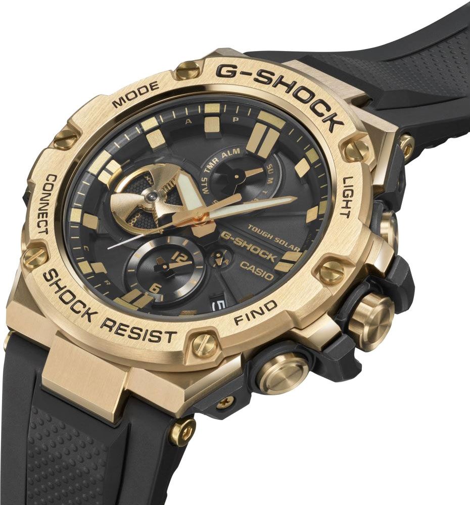 Мужские кварцевые аналого-цифровые наручные часы на солнечной батарее. Серия G-Shock G-Steel. Противоударный корпус защищает механизм часов от ударов и вибрации. Питание от солнечной энергии (технология Tough Solar) - источником питания служит светочувствительная панель и аккумулятор, подзаряжаемый при попадании солнечного света на циферблат часов. Индикатор уровня заряда батареи. Функция автоматического сохранения энергии (стрелки останавливаются для экономии энергии, когда часы остаются в темноте). Время работы аккумулятора без подзарядки приблизительно 5 месяцев, при включенной функции сохранения энергии приблизительно 24 месяца. Двойная светодиодная подсветка обеспечивает подсветку не только аналогового циферблата, но и цифрового дисплея. Настраиваемое послесвечение 1,5 с или 3 с. Необритовое светонакопительное покрытие стрелок и часовых индексов обеспечивает длительное послесвечение в темноте после кратковременного воздействия света. 12-ти и 24-х часовой формат отображения времени (дополнительный малый циферблат в позиции 6 ч). Секундомер с точностью показаний 1с и временем измерения 24ч. Режимы измерения: прошедшее время, промежуточное время. Таймер обратного отсчета от 1с до 1ч с шагом в 1 мин. Второй часовой пояс. Беспроводная технология Bluetooth® со сверхнизким потреблением энергии для синхронизации со смартфоном. При подключении к смартфону часы корректируют текущее время (до 4 раз в день) и получают доступ к ряду полезных функций. Ежедневный будильник, почасовой сигнал времени. Время звучания сигнала 10 секунд. Автоматический календарь до 2099 г. Система Smart Access с помощью электронной переводной головки обеспечивает простой и удобный доступ ко всем важным функциям часов. Нажатие или поворот переводной головки позволяет переключаться между различными режимами и активировать будильник, таймер, секундомер, а также настраивать функцию мирового времени. Функция поиска телефона. Чёрный циферблат с метками в виде штрихов. Окошко даты в положении между 4 и 5 ч. День недели отображается на отдельном малом циферблате в позиции 12 ч. Устойчивое к мелким механическим повреждениям минеральное стекло. Пластиковый корпус. Стальной безель с IP покрытием цвета жёлтого золота. Размеры корпуса 53,8 мм на 58,1 мм , толщина 14,1 мм. Переводная головка с защитой и блокировкой. Чёрный пластиковый ремешок с классической застежкой buckle. Водонепроницаемость 200 WR (плавание и ныряние без акваланга). Вес около 101 г.