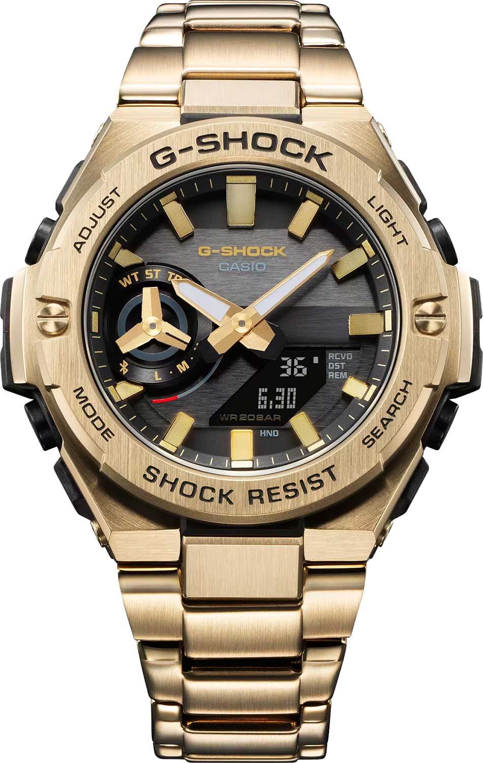 Мужские кварцевые аналого-цифровые наручные часы на солнечной батарее. Серия G-Shock G-Steel. Противоударный корпус защищает механизм часов от ударов и вибрации. Питание от солнечной энергии (технология Tough Solar) - источником питания служит светочувствительная панель и аккумулятор, подзаряжаемый при попадании солнечного света на лицевую поверхность часов. Индикатор уровня заряда батареи. Время работы аккумулятора без подзарядки приблизительно 7 месяцев, при включенной функции сохранения энергии приблизительно 18 месяцев. Функция автоматического сохранения энергии. Двойная светодиодная подсветка Super Illuminator обеспечивает подсветку не только аналогового циферблата, но и цифрового дисплея. Настраиваемое послесвечение 1,5 с или 3 с. Необритовое светонакопительное покрытие стрелок и часовых индексов обеспечивает длительное послесвечение в темноте даже после кратковременного воздействия света. 12-ти и 24-х часовой формат отображения времени. Секундомер с точностью показаний 1/100 с (в течение первого часа) и 1с (через 1 час) и временем измерения 24ч. Режимы измерения: прошедшее время, время прохождения части и круга дистанции. Таймер обратного отсчета от 1с до 1ч с интервалом в 1 секунду. Сигнал оповещения об окончании обратного отсчета звучит в течение 10 секунд. Мировое время – 38 городов (38 часовых поясов), всемирное координированное время (UTC). Функция включения/отключения летнего времени. Переключение между домашним и мировым временем. Беспроводная технология Bluetooth® со сверхнизким потреблением энергии для синхронизации со смартфоном. При подключении к смартфону часы корректируют текущее время (до 4 раз в день) и получают доступ к ряду полезных функций. 5 ежедневных будильников, почасовой сигнал времени. Автоматический календарь до 2099 г, отображение дней недели на шести языках. Включение/выключение звука кнопок. Функция перемещения стрелок. Функция поиска телефона. Центральные часовая и минутная стрелки. Чёрный циферблат с часовыми метками в виде штрихов. Устойчивое к мелким механическим повреждениям минеральное стекло. Корпус из нержавеющей стали, армированный углеродными волокнами (структура Carbon Core Guard) и с покрытием цвета жёлтого золота. Размеры корпуса 46,6 мм на 48,, мм , толщина 12,8 мм. Браслет из нержавеющей стали с покрытием цвета жёлтого золота, раскладывающаяся застежка. Водонепроницаемость 200 WR (плавание и ныряние без акваланга). Вес около 143 г.