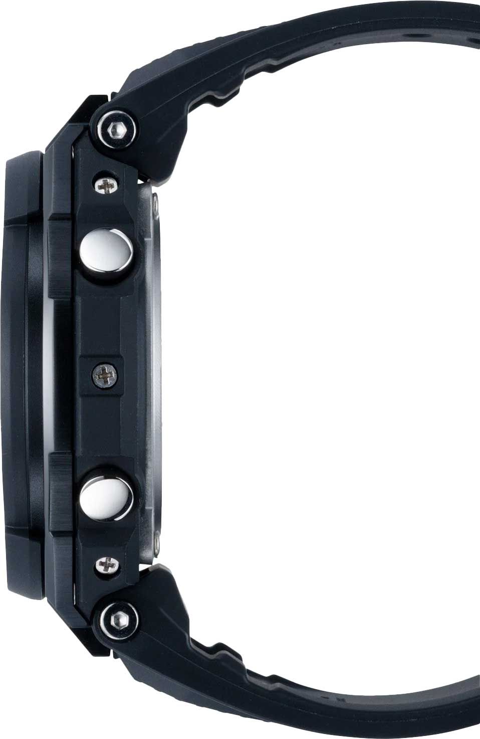 Мужские кварцевые аналого-цифровые наручные часы на солнечной батарее. Серия G-Shock G-Steel. Противоударный корпус защищает механизм часов от ударов и вибрации. Питание от солнечной энергии (технология Tough Solar) - источником питания служит светочувствительная панель и аккумулятор, подзаряжаемый при попадании солнечного света на циферблат часов. Индикатор уровня заряда батареи. Режим экономии энергии. Время работы аккумулятора без подзарядки приблизительно 8 месяцев, при включенной функции сохранения энергии приблизительно 19 месяцев. Двойная светодиодная подсветка обеспечивает подсветку не только аналогового циферблата, но и цифрового дисплея. Настраиваемое послесвечение 1,5 с или 3 с. Необритовое светонакопительное покрытие стрелок обеспечивает длительное послесвечение в темноте после кратковременного воздействия света. 12-ти и 24-х часовой формат отображения времени. Секундомер с точностью показаний 1/100 секунды и временем измерения 1ч. Режимы измерения: прошедшее время, промежуточное время, два финишных результата. Таймер обратного отсчета от 1 минуты до 100 минут (с интервалом в 1 секунду). Мировое время – 48 городов (31 часовой пояс), всемирное координированное время (UTC), автоматический переход на зимнее и летнее время, возможность включения/отключения данной функции, переключение между домашним и мировым временем. 5 ежедневных будильников, сигнал начала часа. Автоматический календарь до 2099 г. Включение/выключение звука кнопок. Функции перемещения стрелок для удобного просмотра информации на цифровом дисплее. Чёрный циферблат с метками в виде штрихов. Устойчивое к мелким механическим повреждениям минеральное стекло. Чёрный пластиковый ремешок с классической застежкой buckle. Водонепроницаемость 200 WR (плавание и ныряние без акваланга). Вес около 97 г.