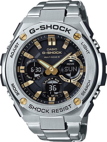 Мужские кварцевые наручные часы c аналого-цифровым отображением времени. Серия Casio G-Shock G-Steel. Противоударный корпус защищает механизм часов от ударов и вибрации. Питание от солнечной энергии (технология Tough Solar) - источником питания служит светочувствительная панель и аккумулятор, заряжаемый при попадании солнечного света на циферблат часов. Индикатор низкого заряда батареи. Функция энергосбережения. Время работы без подзарядки в обычном режиме около 8 месяцев, в режиме энергосбережения около 19 месяцев. Двойная автоматическая светодиодная подсветка (поворот руки при недостаточном освещении обеспечит автоматическое включение подсветки циферблата) с возможностью выбора продолжительности освещения 1.5 или 3 секунды, послесвечение. Светочувствительное покрытие стрелок обеспечивает продолжительное послесвечение в темноте после непродолжительного воздействия света. Автоматическая настройка времени по радиосигналу (Wave Ceptor) - автоматический прием 6 раз в день. Секундомер с точностью показаний 1/100 секунды и временем измерения 1 час. Режимы измерения: прошедшее время, промежуточное время, два финишных результата. Таймер обратного отсчета от 1 минуты до 100 минут (с интервалом в 1 секунду). Мировое время 31 часовая зона (48 городов), всемирное координированное время (UTC), включение/отключение летнего времени. 12/24-х часовой формат отображения времени. 5 ежедневных будильников, один с функцией повтора сигнала Snooze, ежечасный сигнал. Автоматический календарь до 2099 г. Функция включения/отключения звука кнопок. Функция перемещения стрелок для удобного просмотра информации на цифровых дисплеях. Круглый корпус размером 59,1 мм на 52,4 мм, толщиной 16,1 мм . Стальной браслет с раскладывающейся застежкой. Водонепроницаемость 200WR (часы подходят для плавания с маской, трубкой, обычного плавания). Вес около 108 г.