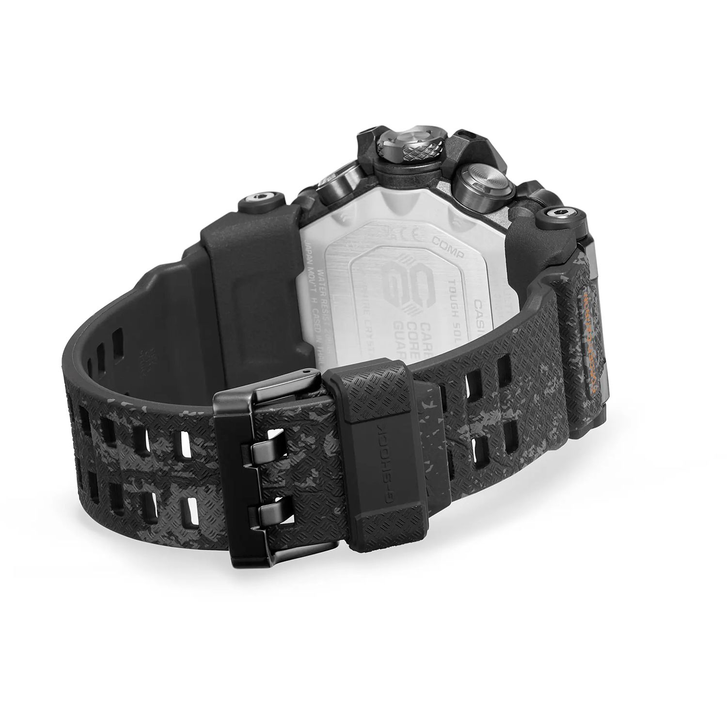 Мужские кварцевые аналого-цифровые наручные часы. Серия G-Shock Mudmaster. Ударопрочная конструкция защищает механизм часов от ударов и вибрации. Грязеустойчивость - особая конструкция предохраняет от попадание грязи и пыли внутрь часов. Устойчивость к воздействию вибрации - модуль часов снабжен элементами из материала alphaGEL, который еще лучше защищает часы от сотрясения и вибрации (alphaGEL представляет собой гибкую силиконовую прослойку, оказывающую амортизирующий эффект). Полностью автоматическая светодиодная подсветка - поворот руки при недостаточном освещении обеспечит автоматическое включение подсветки дисплея. Неоновый дисплей - светящееся покрытие обеспечивает длительную подсветку в темное время суток после короткого воздействия света. Питание от солнечной энергии (технология Tough Solar) - в часах источником питания служит светочувствительная панель и аккумулятор, заряжаемый при попадании солнечного света на циферблат часов. Прием радиосигнала (Европа, США, Япония, Китай) для корректировки точности времени. Система Smart Access с помощью переводной головки обеспечивает простой и удобный доступ ко всем важным функциям часов - нажатие или поворот переводной головки позволяет переключаться между различными режимами и активировать будильник, таймер, секундомер, а также настраивать функцию мирового времени. Функция секундомера с точностью измерения 1/100 с и пределом измерения 24 часа. Режимы измерения: прошедшее время, промежуточное время, два финишных результата. Таймер обратного отсчета от 1 секунды до 60 минут с автоповтором. Барометр - специальный датчик измеряет давление воздуха (диапазон измерений составляет 260 / 1100 гПа, 1 гПа = 0,75 мм рт. ст. или 1 мм рт. ст. = 1,333 гПа) и отображает измеренное значение на экране в виде символа. Термометр- датчик измеряет температуру окружающего воздуха вокруг часов и отображает ее на экране в градусах °C (-10°C /+60°C). Цифровой компас. Высотомер 10,000 м - встроенный датчик давления определяет изменения в атмосферном давлении и преобразовывает полученные результаты в абсолютную высоту до 10 000 м. График набора высоты. Память данных высотомера —в записной книжке хранятся данные о результатах измерений, выполненных в режиме высотомера. Функция мирового времени - 29 городов (29 часовых поясов), всемирное координированное время (UTC), летнее время. 5 ежедневных будильников, сигнал начала часа. Функция автоматической настройки положения стрелок проверяет исходное положение стрелок каждый час и корректирует его в случае необходимости (изменение после удара, либо из-за влияния магнитного поля). Включение/выключение звука кнопок. Функция перемещения стрелок. Автоматический календарь до 2099 г. 12/24-х часовой формат отображения времени. Индикатор уровня заряда аккумулятора, режим экономии энергии. Блокировка переводной головки. Сапфировое стекло устойчивое к мелким царапинам. Усиленный углеродными волокнами пластиковый корпус (технология Carbon Core Guard). Ремешок из полимерного пластика со стандартной застежкой buckle. Водонепроницаемость 200WR (плавание и ныряние без акваланга). Вес около 106 г.