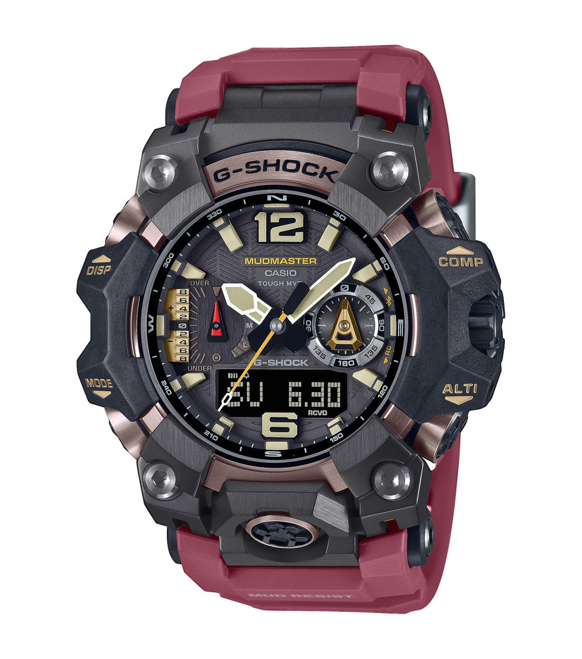 Мужские кварцевые аналогово-цифровые наручные часы на солнечной батарее. Серия G-SHOCK Mudmaster. Ударопрочная конструкция защищает механизм часов от ударов и вибрации. Часы обладают грязеустойчивостью - особая конструкция предохраняет от попадание грязи и пыли внутрь часов. Устойчивость к воздействию магнитного поля - защитный модуль сохраняет электронику и исключает любые помехи в работе часов. Синхронизация со смартфоном по беспроводной технологии Bluetooth® . При подключении к смартфону часы корректируют текущее время (до 4 раз в день) и получают доступ к целому ряду полезных функций. Полностью автоматическая светодиодная подсветка - поворот руки при недостаточном освещении обеспечит автоматическое включение подсветки дисплея. Светящееся покрытие на стрелках обеспечивает длительную подсветку в темное время суток после короткого воздействия света. Солнечная батарея (технология Tough Solar) - в часах источником питания служит светочувствительная панель и аккумулятор, подзаряжаемый при попадании солнечного света на лицевую поверхность часов. Прием радиосигнала (Европа, США, Япония, Китай) для корректировки точности времени. Система Smart Access с помощью переводной головки обеспечивает простой и удобный доступ ко всем важным функциям часов - нажатие или поворот переводной головки позволяет переключаться между различными режимами и активировать будильник, таймер, секундомер, а также настраивать функцию мирового времени. Функция секундомера с точностью измерения 1/100 с и пределом измерения 24 часа. Режимы измерения: прошедшее время, промежуточное время, 2 финишных результата. Таймер обратного отсчёта от 1 минуты до 60 минут (с шагом 1 минута) с автоповтором. Барометр (260 / 1.100 hPa) - специальный датчик измеряет давление воздуха (диапазон измерений составляет 260 / 1100 гПа, 1 гПа = 0,75 мм рт. ст. или 1 мм рт. ст. = 1,333 гПа) и отображает измеренное значение на экране в виде символа. Термометр (-10°C / +60°C) - датчик измеряет температуру окружающего воздуха вокруг часов и отображает ее на экране в градусах °C (-10°C /+60°C). Цифровой компас. Высотомер (альтиметр) 10,000 м - встроенный датчик давления определяет изменения в атмосферном давлении и преобразовывает полученные результаты в абсолютную высоту до 10 000 м.. График набора высоты. Память данных высотомера —в записной книжке хранятся данные о результатах измерений, выполненных в режиме высотомера. Отображение времени восхода и захода солнца для определенной даты. Индикатор местоположения указывает направление и расстояние до ранее сохраненного местоположения. Функция мирового времени - 38 часовых поясов (55 городов), всемирное координированное время, включение/выключение летнего времени, автоматическое переключение на летнее время (DST), переключение местного на мировое время. 5 ежедневных будильнико, почасовой сигнал времени. Функция автоматической настройки положения стрелок проверяет исходное положение стрелок каждый час и корректирует его в случае необходимости (изменение после удара, либо из-за влияния магнитного поля). Включение/выключение звука кнопок. Функция перемещения стрелок. Автоматический календарь до 2099 года. 12/24-х часовой формат отображения времени. Индикатор уровня заряда аккумулятора. Функция энергосбережения - дисплей гаснет, а стрелки останавливаются для экономии энергии, когда часы остают