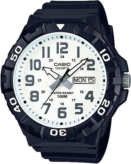 Мужские аналоговые кварцевые часы. Центральные часовая, минутная и секундная стрелки. Чёрный циферблат с часовыми метками в виде арабских цифр. Стрелки и метки с люминесцентным покрытием, которое светится в темноте после непродолжительного воздействия света. Окошко даты и дня недели в позиции 3 ч. 12-ти и 24-х часовой формат отображения времени. Пластиковое стекло. Переводная головка с защитой. Круглый корпус из полимерного пластика. Размеры корпуса 55 мм на 53 мм, толщина 13,7 мм. Безель с односторонним вращением. Пластиковый ремешок со стандартной застёжкой buckle. Водонепроницаемость 100 WR (плавание и ныряние без акваланга). Вес около 61 г.