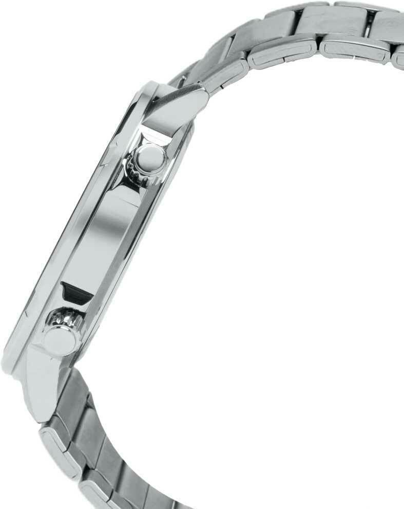 Мужские аналоговые кварцевые часы. Центральные часовая, минутная и секундная стрелки. Чёрный циферблат с часовыми метками в виде штрихов. Стрелки и метки с люминесцентным покрытием, которое светится в темноте после непродолжительного нахождения на свету. Апертура даты и дня недели в позиции 4 ч. Устойчивое к мелким механическим повреждениям минеральное стекло. Вращающийся внутренний безель со шкалой компаса (для определения направления надо совместить часовую стрелку с положением солнца, и биссектриса (середина) угла между часовой стрелкой и отметкой 12 часов укажет на юг, для определения остальных сторон света, нужно повернуть безель до совмещения отметки S с полученной биссектрисой. Точность такого варианта измерения приблизительна и сильно зависит от местоположения (Северное полушарие) и времени года). Круглый корпус из нержавеющей стали. Переводная головка с защитой находится в положении 4 часа. Стальной браслет с раскладывающейся застёжкой. Водонепроницаемость 100WR (плавание и ныряние без акваланга) Вес около 126 г.