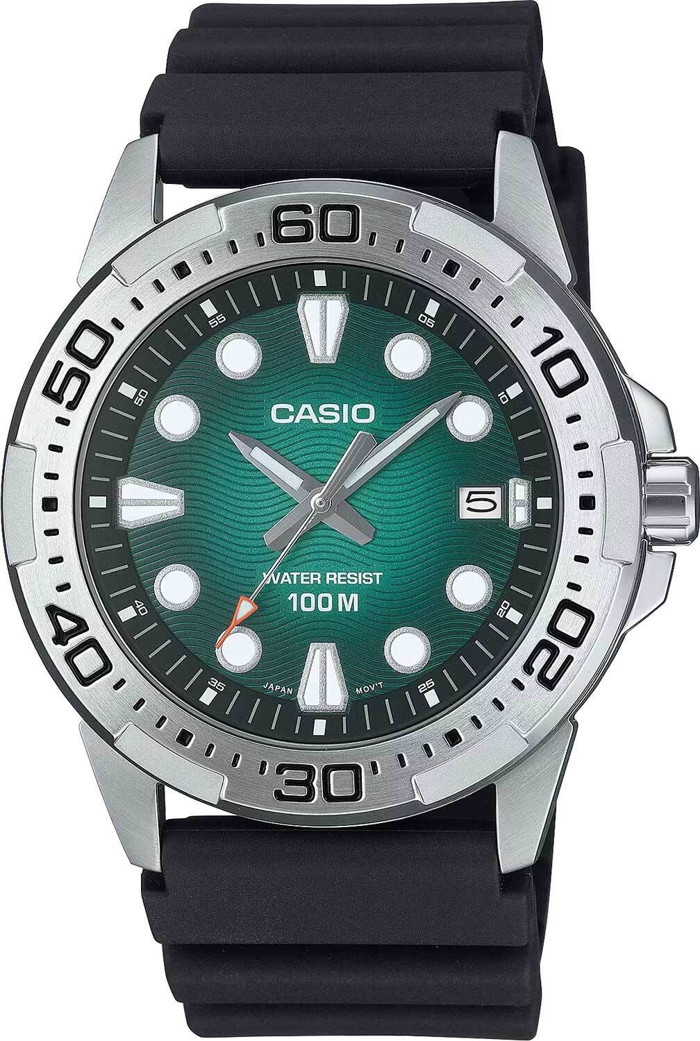 Мужские кварцевые наручные часы с аналоговым отображением времени. Серия Casio Collection. Центральные часовая, минутная и секундная стрелки. Зелёный циферблат с часовыми метками в виде штрихов и точек. Стрелки и метки с люминесцентным покрытием, которое светится в темноте после непродолжительного воздействия света. Индикация даты в позиции 3 часов (значение даты меняется до 31, для месяцев, у которых количество дней меньше 31, необходимо корректировать значение вручную). Устойчивое к мелким механическим повреждениям минеральное стекло. Круглый стальной корпус размером 43,7 мм на 48,4 мм, толщиной 9,5 мм. Минутная шкала на безеле. Переводная головка с защитой. Пластиковый ремешок чёрного цвета с классической застёжкой buckle. Батарейка рассчитана на 3 года. Водонепроницаемость 100WR (часы подходят для плавания с маской, трубкой и обычного плавания). Вес около 75 г.