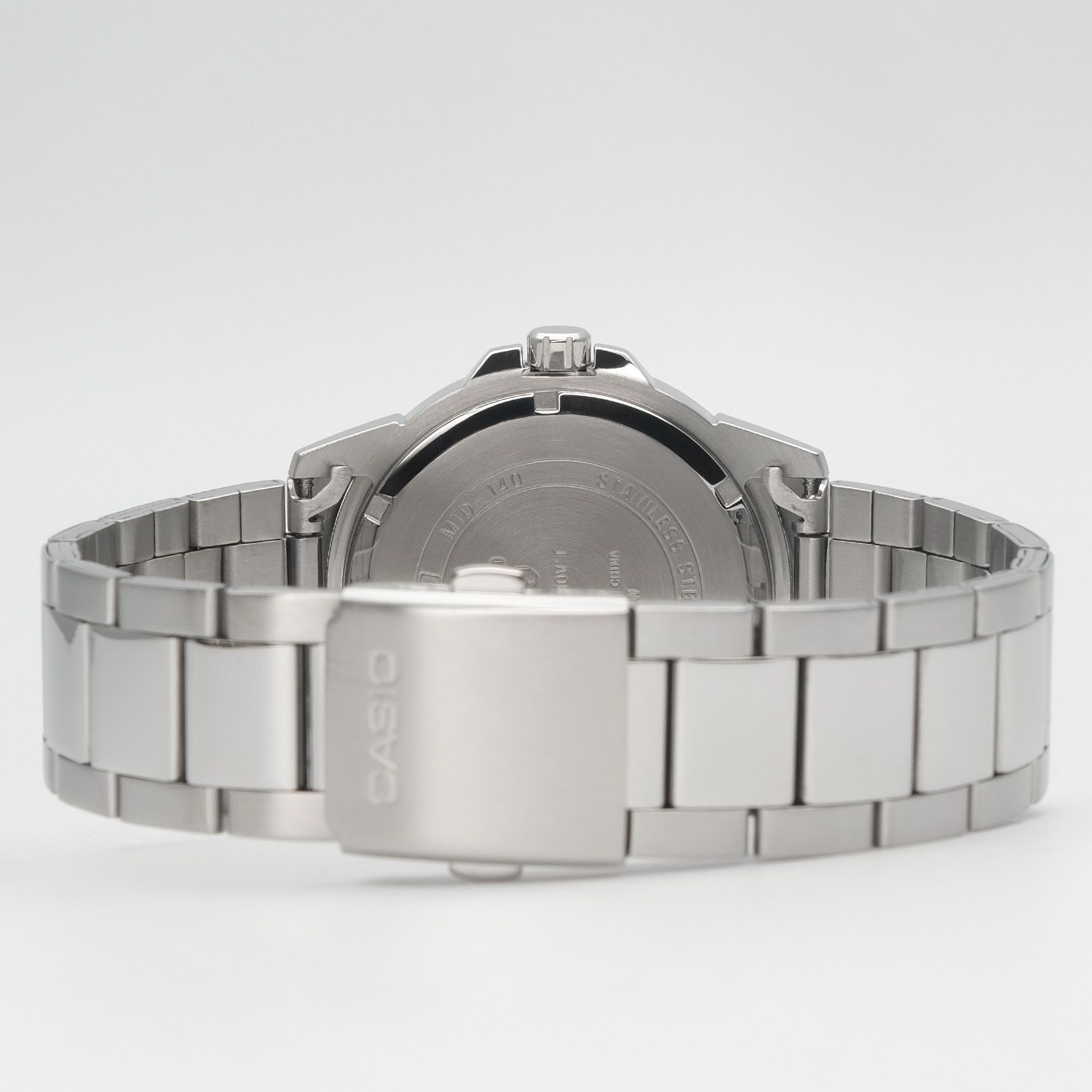 Мужские кварцевые наручные часы с аналоговым отображением времени. Серия Casio Collection. Центральные часовая, минутная и секундная стрелки. Чёрный циферблат с часовыми метками в виде штрихов и точек. Стрелки и метки с люминесцентным покрытием, которое светится в темноте после непродолжительного воздействия света. Индикация даты в позиции 3 часов (значение даты меняется до 31, для месяцев, у которых количество дней меньше 31, необходимо корректировать значение вручную). Устойчивое к мелким механическим повреждениям минеральное стекло. Круглый стальной корпус размером 43,7 мм на 48,4 мм, толщиной 9,5 мм. Минутная шкала на безеле. Переводная головка с защитой. Стальной браслет с тройной раскладывающейся застежкой. Батарейка рассчитана на 3 года. Водонепроницаемость 100WR (часы подходят для плавания с маской, трубкой и обычного плавания). Вес около 138 г.