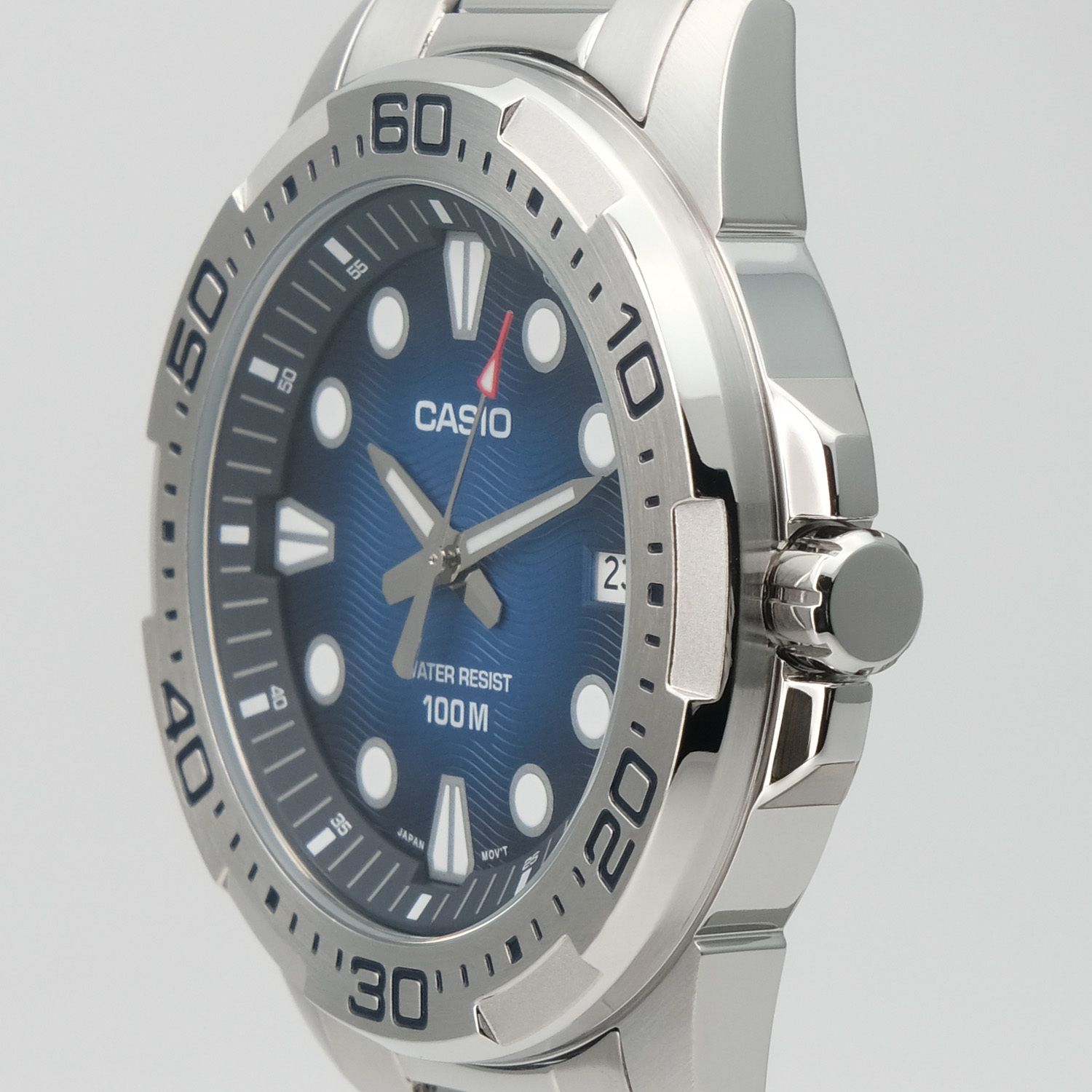 Мужские кварцевые наручные часы с аналоговым отображением времени. Серия Casio Collection. Центральные часовая, минутная и секундная стрелки. Синий циферблат с часовыми метками в виде штрихов и точек. Стрелки и метки с люминесцентным покрытием, которое светится в темноте после непродолжительного воздействия света. Индикация даты в позиции 3 часов (значение даты меняется до 31, для месяцев, у которых количество дней меньше 31, необходимо корректировать значение вручную). Устойчивое к мелким механическим повреждениям минеральное стекло. Круглый стальной корпус размером 43,7 мм на 48,4 мм, толщиной 9,5 мм. Минутная шкала на безеле. Переводная головка с защитой. Стальной браслет с тройной раскладывающейся застежкой. Батарейка рассчитана на 3 года. Водонепроницаемость 100WR (часы подходят для плавания с маской, трубкой и обычного плавания). Вес около 138 г.