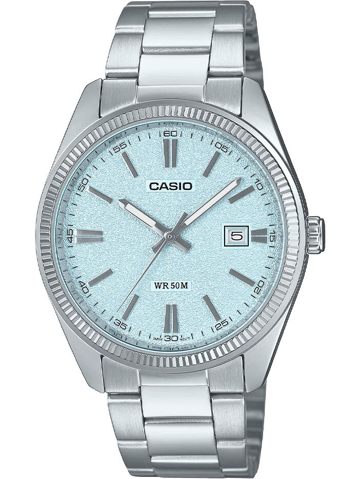 Мужские кварцевые часы с аналоговым отображением времени. Серия General Collection. Центральные часовая, минутная и секундная стрелки. Голубой матовый текстурированный циферблат с часовыми метками в виде штрихов. Стрелки с люминесцентным покрытием, которое светится в темноте после непродолжительного воздействия света. Окошко даты в позиции 3 часов. Минутная шкала на циферблате. Устойчивое к мелким механическим повреждениям минеральное стекло. Круглый корпус из нержавеющей стали. Размеры корпуса 44,2 мм на 38,5 мм, толщина 9,4 мм. Рифлёный безель. Стальной браслет с тройной раскладывающейся застежкой. Батарейка рассчитана на 3 года. Водонепроницаемость 50WR (мытьё рук, дождь). Вес около 104 г.