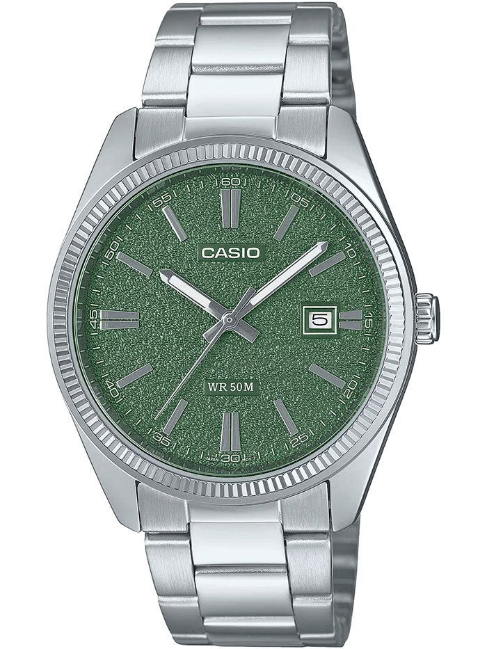 Мужские кварцевые часы с аналоговым отображением времени. Серия General Collection. Центральные часовая, минутная и секундная стрелки. Зелёный матовый текстурированный циферблат с часовыми метками в виде штрихов. Стрелки с люминесцентным покрытием, которое светится в темноте после непродолжительного воздействия света. Окошко даты в позиции 3 часов. Минутная шкала на циферблате. Устойчивое к мелким механическим повреждениям минеральное стекло. Круглый корпус из нержавеющей стали. Размеры корпуса 44,2 мм на 38,5 мм, толщина 9,4 мм. Рифлёный безель. Стальной браслет с тройной раскладывающейся застежкой. Батарейка рассчитана на 3 года. Водонепроницаемость 50WR (мытьё рук, дождь). Вес около 104 г.