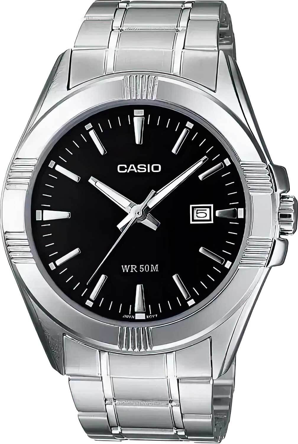 Мужские кварцевые аналоговые наручные часы. Серия Casio Collection. Центральные часовая, минутная и секундная стрелки. Чёрный циферблат с часовыми метками в виде штрихов. Стрелки и метки с люминесцентным покрытием, которое светится в темноте после непродолжительного воздействия света. Окошко даты в положении 3 ч. Устойчивое к мелким механическим повреждениям минеральное стекло. Круглый корпус серебристого цвета размером 48,9 мм на 43,5 мм, толщиной 9,2 мм. Переводная головка с защитой. Стальной браслет с тройной раскладывающейся застежкой. Батарейка рассчитана на 3 года. Водонепроницаемость 50WR (мытьё рук, дождь). Вес около 123 г.