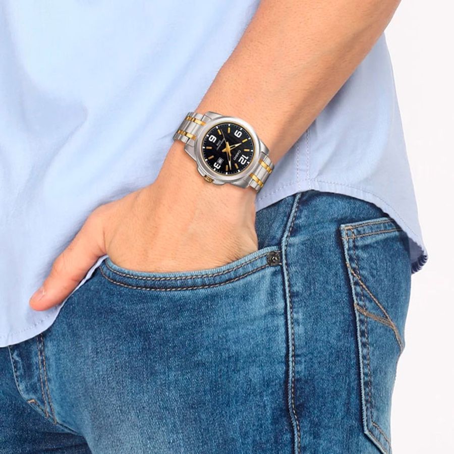 Мужские кварцевые часы с аналоговым отображение времени. Серия Casio Collection. Центральные часовая, минутная и секундная стрелки. Чёрный циферблат с часовыми метками в виде штрихов и четырёх арабских цифр (12, 3, 6 и 9). Стрелки с люминесцентным покрытием, которое светится в темноте после непродолжительного воздействия света. Окошко даты в положении 3 ч. Устойчивое к мелким механическим повреждениям минеральное стекло. Круглый корпус из гипоаллергенной латуни серебристого цвета. Размер корпуса 50 мм на 44,9 мм, толщина 9,4 мм. Рифлёная переводная головка с защитой. Стальной браслет с частичным PVD покрытием цвета жёлтого золота, тройная раскладывающаяся застежка. . Батарейка рассчитана на 3 года. Водонепроницаемость 50WR (мытьё рук, дождь). Вес около 126 г.