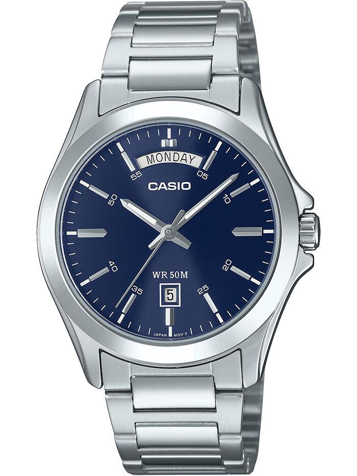 Мужские кварцевые часы с аналоговым отображением времени. Серия General Collection. Центральные часовая, минутная и секундная стрелки. Синий циферблат с часовыми метками в виде штрихов. Стрелки с люминесцентным покрытием, которое светится в темноте после непродолжительного воздействия света. Окошко даты в позиции 3 часов, дня недели в позиции 12 часов (значение даты меняется до 31, для месяцев, у которых количество дней меньше 31, необходимо корректировать значение вручную). Минутная шкала на циферблате. Устойчивое к мелким механическим повреждениям минеральное стекло. Круглый корпус из гипоаллергенной латуни. Размеры корпуса 45 мм на 39,8 мм, толщина 8,8 мм. Переводная головка с защитой. Стальной браслет с раскладывающейся застежкой. Водонепроницаемость 50WR (мытьё рук, дождь). Вес около 96 г.