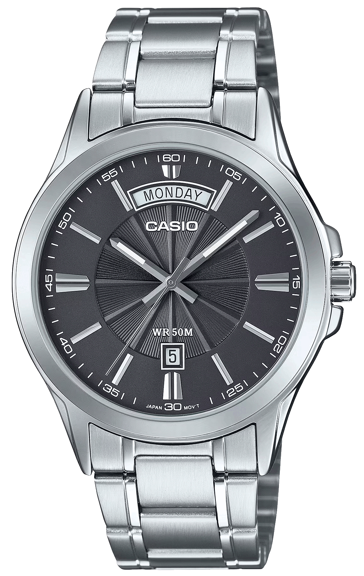Мужские кварцевые часы с аналоговым отображением времени. Серия General Collection. Центральные часовая, минутная и секундная стрелки. Серый циферблат с часовыми метками в виде штрихов. Стрелки с люминесцентным покрытием, которое светится в темноте после непродолжительного воздействия света. Окошко даты в позиции 3 часов, дня недели в позиции 12 часов (значение даты меняется до 31, для месяцев, у которых количество дней меньше 31, необходимо корректировать значение вручную). Минутная шкала на циферблате. Устойчивое к мелким механическим повреждениям минеральное стекло. Круглый корпус из нержавеющей стали. Размер корпуса 46,6 мм на 39,9 мм, толщина 8,9 мм. Переводная головка с защитой. Стальной браслет с раскладывающейся застежкой. Водонепроницаемость 50WR (мытьё рук, дождь). Вес около 104 г.