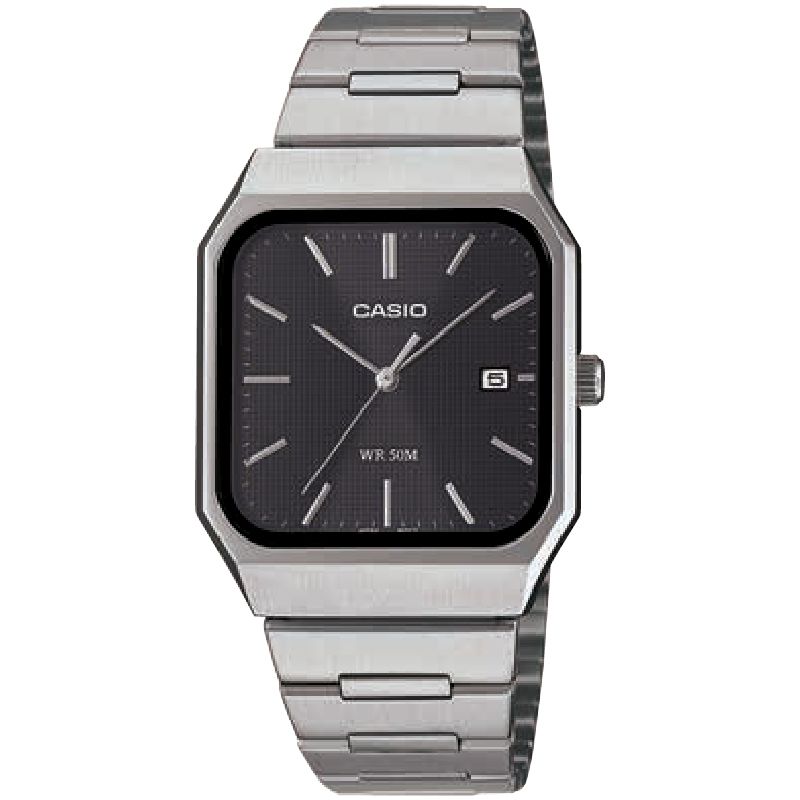 Мужские кварцевые часы с аналоговым отображением времени. Серия General Collection. Центральные часовая, минутная и секундная стрелки. Чёрный циферблат с часовыми метками в виде штрихов. Окошко даты в позиции 3 часов (значение даты меняется до 31, для месяцев, у которых количество дней меньше 31, необходимо корректировать значение вручную). Устойчивое к мелким механическим повреждениям минеральное стекло. Прямоугольный корпус из нержавеющей стали. Размер корпуса 40 мм на 32,5 мм, толщина 7,3 мм. Рифлёная переводная головка. Стальной браслет с раскладывающейся застежкой. Водонепроницаемость 50WR (мытьё рук, дождь). Вес около 80 г.