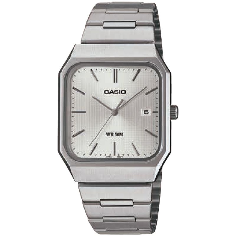 Мужские кварцевые часы с аналоговым отображением времени. Серия General Collection. Центральные часовая, минутная и секундная стрелки. Серебристый циферблат с часовыми метками в виде штрихов. Окошко даты в позиции 3 часов (значение даты меняется до 31, для месяцев, у которых количество дней меньше 31, необходимо корректировать значение вручную). Устойчивое к мелким механическим повреждениям минеральное стекло. Прямоугольный корпус из нержавеющей стали. Размер корпуса 40 мм на 32,5 мм, толщина 7,3 мм. Рифлёная переводная головка. Стальной браслет с раскладывающейся застежкой. Водонепроницаемость 50WR (мытьё рук, дождь). Вес около 80 г.