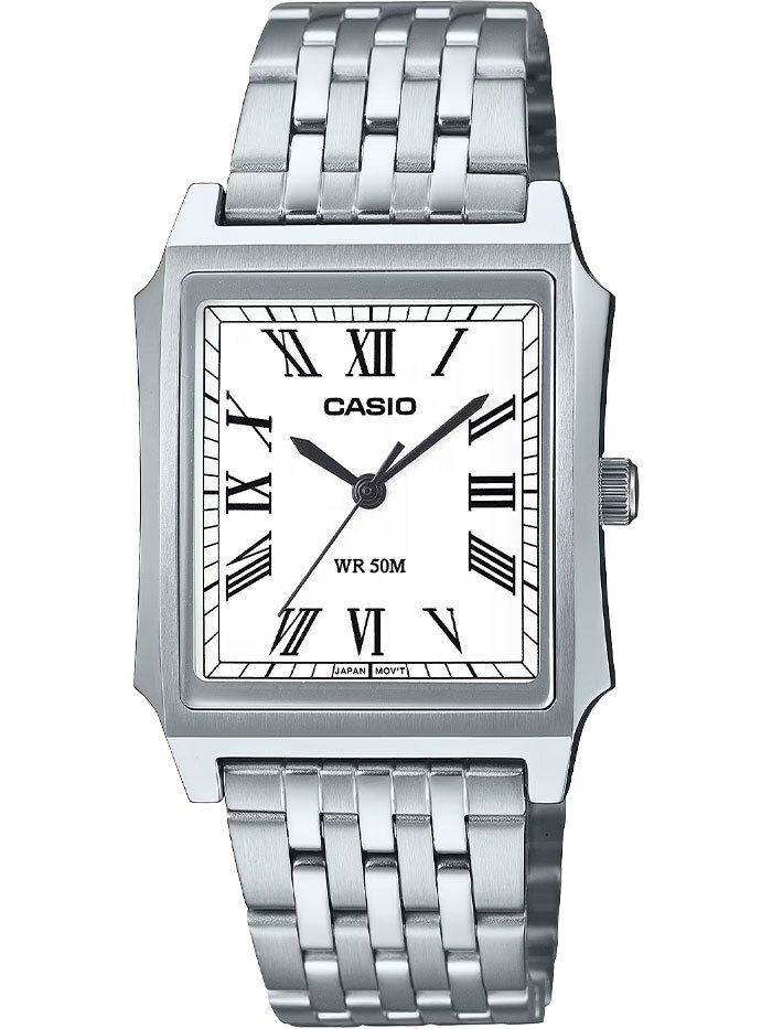 Мужские кварцевые часы с аналоговым отображением времени. Серия General Collection. Центральные часовая, минутная и секундная стрелки. Белый циферблат с часовыми метками в виде римских цифр. Устойчивое к мелким механическим повреждениям минеральное стекло. Прямоугольный корпус из нержавеющей стали. Размер корпуса 41 мм на 31,5 мм, толщина 8,1 мм. Рифлёная переводная головка. Стальной браслет с раскладывающейся застежкой. Водонепроницаемость 50WR (мытьё рук, дождь). Вес около 97 г.