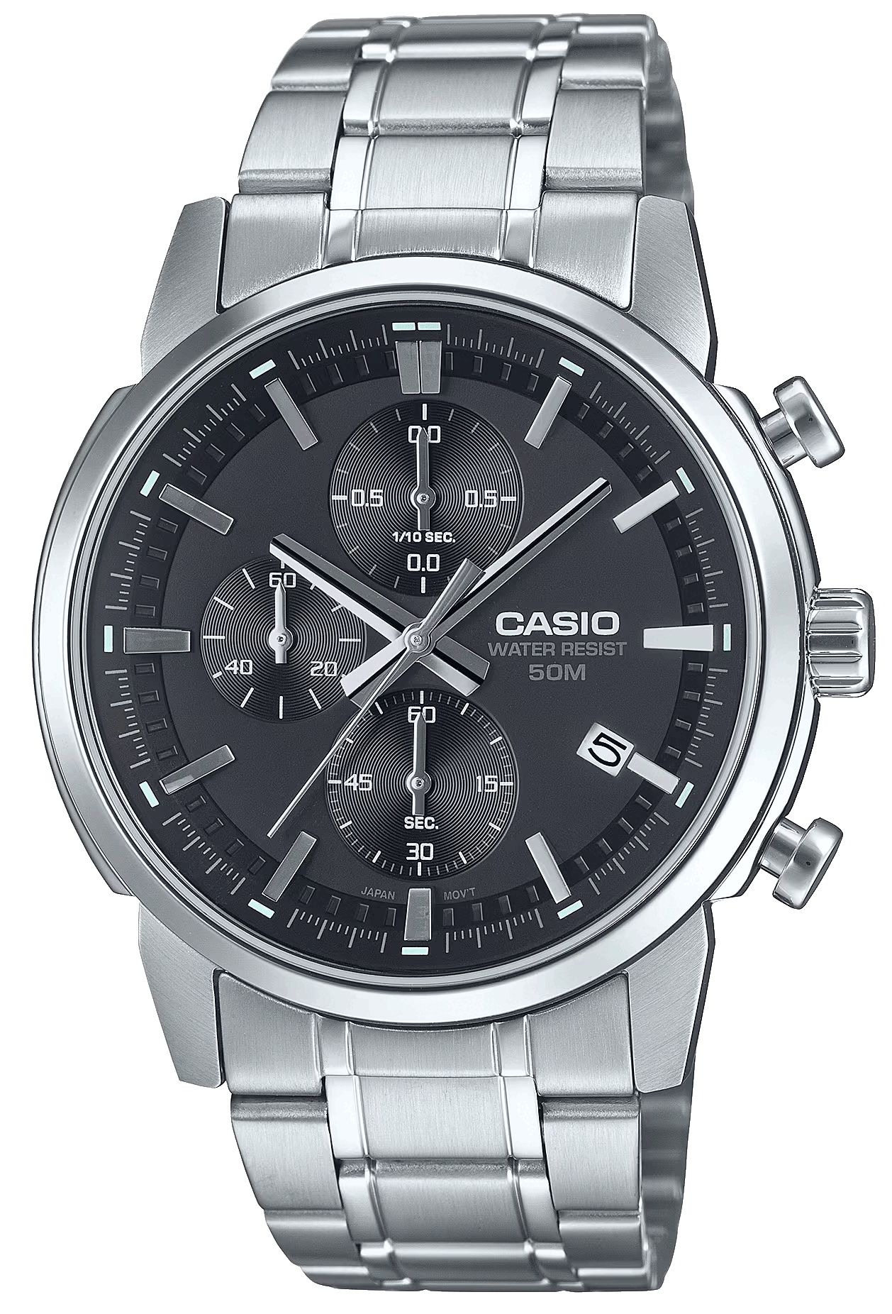 Мужские кварцевые аналоговые наручные часы. Коллекция Standard. Центральные часовая, минутная и секундная стрелки. Чёрный циферблат с часовыми метками в виде штрихов. Окошко даты в позиции 4 ч. Устойчивое к мелким механическим повреждениям минеральное стекло. Секундомер с точностью показаний 1/10 секунды и временем измерения 60 минут. Режимы измерения: прошедшее время, промежуточное время, два финишных результата. Круглый стальной корпус. Размеры корпуса 42x47,5мм, толщина 10,5 мм. Батарейка рассчитана на 2 года. Стальной браслет с раскладывающейся застёжкой. Завинчивающаяся задняя крышка. Водонепроницаемость 50WR (мытьё рук, дождь). Вес около 119 г.