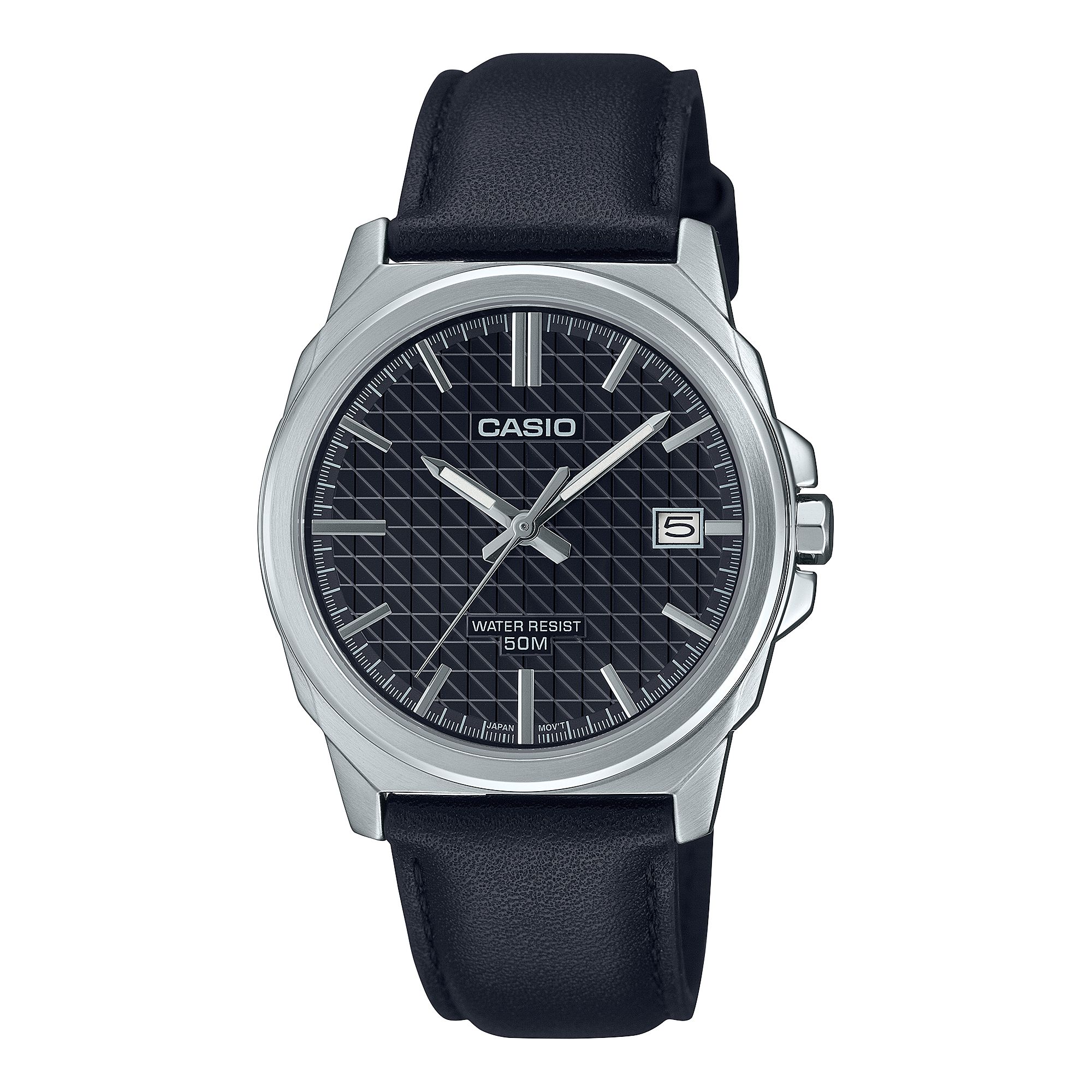 Мужские аналоговые кварцевые наручные часы. Standard Collection. Центральные часовая, минутная и секундная стрелки. Стрелки с люминесцентным покрытием, которое светится в темноте после непродолжительного нахождения на свету. Чёрный циферблат с часовыми метками в виде штрихов. Апертура даты в положении 3 ч. Круглый корпус из нержавеющей стали. Устойчивое к мелким механическим повреждениям минеральное стекло. Рифлёная переводная головка с защитой. Чёрный кожаный ремешок со стандартной застёжкой. Водонепроницаемость 50WR (мытьё рук, дождь). Вес около 46 г.