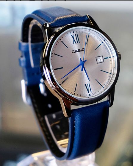Мужские кварцевые наручные часы с аналоговым отображением времени (стрелочные). Серия Casio Classic Collection. Практичные и удобные часы для повседневного использования. Центральные часовая, минутная и секундная стрелки. Серебристый циферблат с часовыми метками в виде штрихов и двух римских цифр XII и VI. Индикация даты в положении 3 часов (значение даты меняется до 31, для месяцев, у которых количество дней меньше 31, необходимо корректировать значение вручную). Устойчивое к мелким механическим повреждениям минеральное стекло. Круглый корпус из гипоаллергенной латуни серебристого цвета. Размер корпуса 37 мм на 44 мм, толщина 9.6 мм. Рифлёная переводная головка в позиции 3 часов. Синий кожаный ремешок с классической застежкой buckle. Батарейка рассчитана на 3 года. Водонепроницаемость 30WR (защита от брызг). Вес около 44 г.