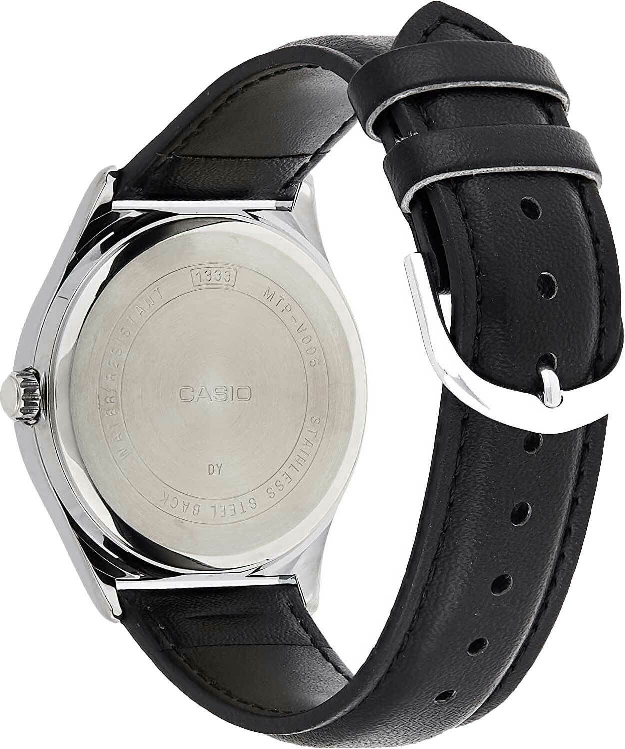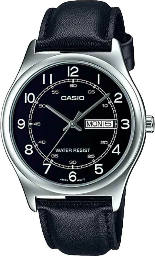 Мужские аналоговые кварцевые часы. Центральные часовая, минутная и секундная стрелки. Чёрный циферблат с часовыми метками в виде арабских цифр. Апертура даты и дня недели в позиции 3 ч. Устойчивое к мелким механическим повреждениям минеральное стекло. Круглый корпус из металла с IP покрытием серебристого цвета. Чёрный кожаный ремешок с классической застёжкой buckle. Водонепроницаемость 30WR (брызги) Вес около 46 г.