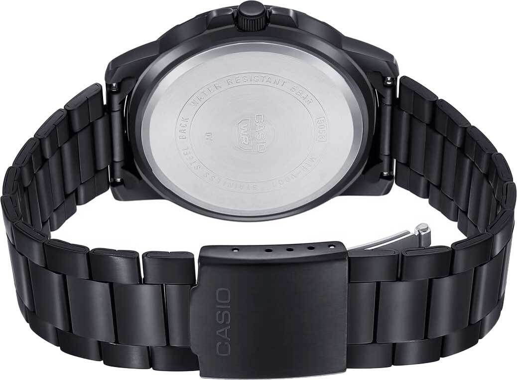 Мужские кварцевые аналоговые наручные часы. Серия Casio Collection. Центральные часовая, минутная и секундная стрелки. Чёрный циферблат с часовыми метками в виде штрихов и трёх арабских цифр. Стрелки и метки с люминесцентным покрытием, которое светится в темноте после непродолжительного воздействия света. Окошко даты в положении 3 ч. Устойчивое к мелким механическим повреждениям минеральное стекло. Круглый стальной корпус с покрытием чёрного цвета. Размер корпуса 49 мм на 45 мм, толщина 10,3 мм. Переводная головка с защитой. Стальной браслет с покрытием чёрного цвета, раскладывающаяся застежка. Батарейка рассчитана на 3 года. Водозащита 50WR (мытьё рук, дождь). Вес около 118 г.