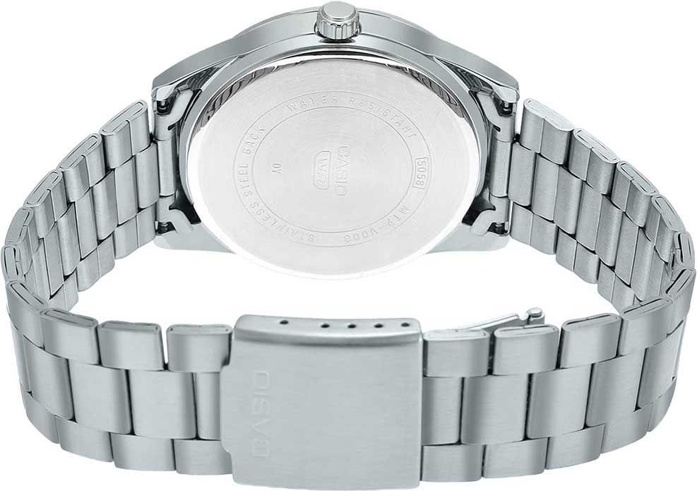 Мужские аналоговые кварцевые часы. Серия Casio Collection. Центральные часовая, минутная и секундная стрелки. Зелёный циферблат с часовыми метками в виде штрихов. Апертура даты в позиции 3 ч. Стрелки с люминесцентным покрытием, которое светится в темноте после непродолжительного воздействия света. Устойчивое к мелким механическим повреждениям минеральное стекло. Круглый корпус из нержавеющей стали. Размеры корпуса 41 мм на 48 мм, толщина 9,6 мм. Браслет из нержавеющей стали с тройной раскладывающейся застежкой. Батарейка рассчитана на 3 года. Водонепроницаемость 30WR (защита от брызг). Вес около 106 г.