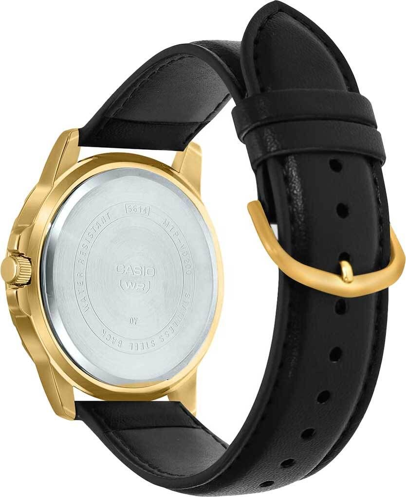 Мужские кварцевые наручные часы с аналоговым отображением времени (стрелочные). Серия Casio Collection. Центральные часовая, минутная и секундная стрелки. Чёрный циферблат с часовыми метками в виде золотистых штрихов и римских цифр. Стрелки с люминесцентным покрытием, которое светится в темноте после непродолжительного воздействия света. Стрелочный индикатор даты вынесен на отдельный малый циферблат в положении 6 часов. Устойчивое к мелким механическим повреждениям минеральное стекло. Круглый стальной корпус с IP покрытием цвета розового золота. Размер корпуса 45 мм на 49 мм, толщина 8,7 мм. Минутная шкала на безеле. Переводная головка с защитой. Чёрный кожаный ремешок с классической застёжкой buckle. Батарея рассчитана на 3 года. Водонепроницаемость 30 WR (защита от брызг). Вес около 64 г.