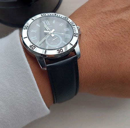 Мужские кварцевые наручные часы с аналоговым отображением времени (стрелочные). Серия Casio Collection. Практичные и удобные часы для повседневного использования. Центральные часовая, минутная и секундная стрелки. Чёрный циферблат с часовыми метками в виде штрихов и римских цифр. Стрелки с люминесцентным покрытием, которое светится в темноте после непродолжительного воздействия света. Стрелочный индикатор даты вынесен на отдельный малый циферблат в положении 6 часов. Устойчивое к мелким механическим повреждениям минеральное стекло. Круглый стальной корпус. Размер корпуса 45 мм на 49 мм, толщина 8,7 мм. Минутная шкала на безеле. Переводная головка с защитой. Чёрный кожаный ремешок с классической застёжкой buckle. Батарея рассчитана на 3 года. Водонепроницаемость 30 WR (защита от брызг). Вес около 64 г.