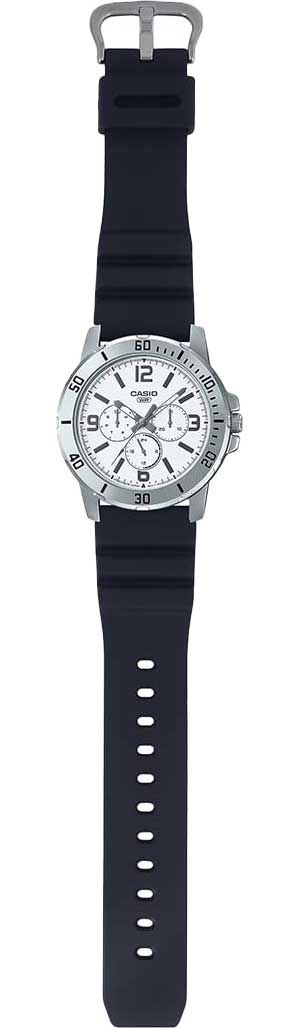 Мужские кварцевые аналоговые наручные часы. Серия Casio Collection. Центральные часовая, минутная и секундная стрелки. Белый циферблат с часовыми метками в виде штрихов и четырёх арабских цифр. Малые циферблаты с указанием числа (в положении 3 ч), дня недели (в положении 9 ч) и суточного времени (в положении 6 ч). Устойчивое к мелким механическим повреждениям минеральное стекло. Круглый стальной корпус размером 49 мм на 45 мм, толщиной 8,7 мм. Переводная головка с защитой. Чёрный пластиковый ремешок с классической застёжкой buckle. Батарейка рассчитана на 3 года. Водозащита 30WR (брызги). Вес около 72 г.