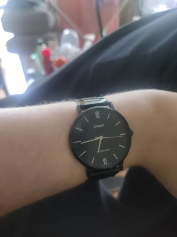 Мужские кварцевые аналоговые наручные часы. Серия Casio Collection. Центральные часовая, минутная и секундная стрелки. Чёрный циферблат с часовыми метками в виде штрихов и двух римских цифр. Устойчивое к мелким механическим повреждениям минеральное стекло. Круглый стальной корпус с покрытием чёрного цвета. Размер корпуса 46 мм на 40 мм, толщина 8,2 мм. Стальной браслет с покрытием чёрного цвета, тройная раскладывающаяся застежка. Батарейка рассчитана на 3 года. Водонепроницаемость 30WR (защита от брызг). Вес около 92 г.