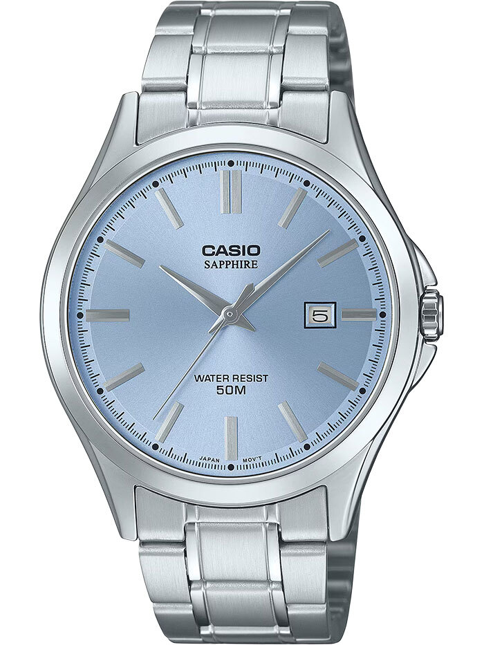 Мужские кварцевые часы с аналоговым отображением времени. Серия General Collection. Центральные часовая, минутная и секундная стрелки. Голубой циферблат с часовыми метками в виде штрихов. Окошко даты в позиции 3 часов (значение даты меняется до 31, для месяцев, у которых количество дней меньше 31, необходимо корректировать значение вручную). Устойчивое к возникновению мелких царапин сапфировое. Круглый стальной корпус размером 47 мм на 41,3 мм, толщиной 8,8 мм. Рифлёная переводная головка с защитой. Стальной браслет с раскладывающейся застежкой. Батарейка рассчитана на 3 года. Водонепроницаемость 50WR (мытьё рук, дождь). Вес около 112 г.